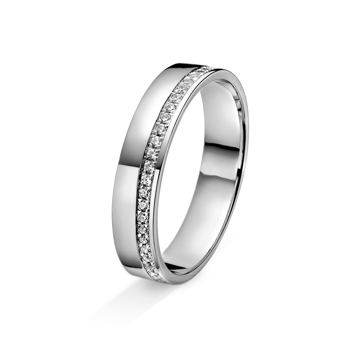 Denne 4,5mm brede ringen i 14 karat gult eller hvitt gull er prydet med en diskret og elegant rad diamanter på totalt 0,15 ct. En tidløs modell med et rent uttrykk som passer like godt som giftering som forlovelsesring. Gratis gravering tilbys etter ønske.