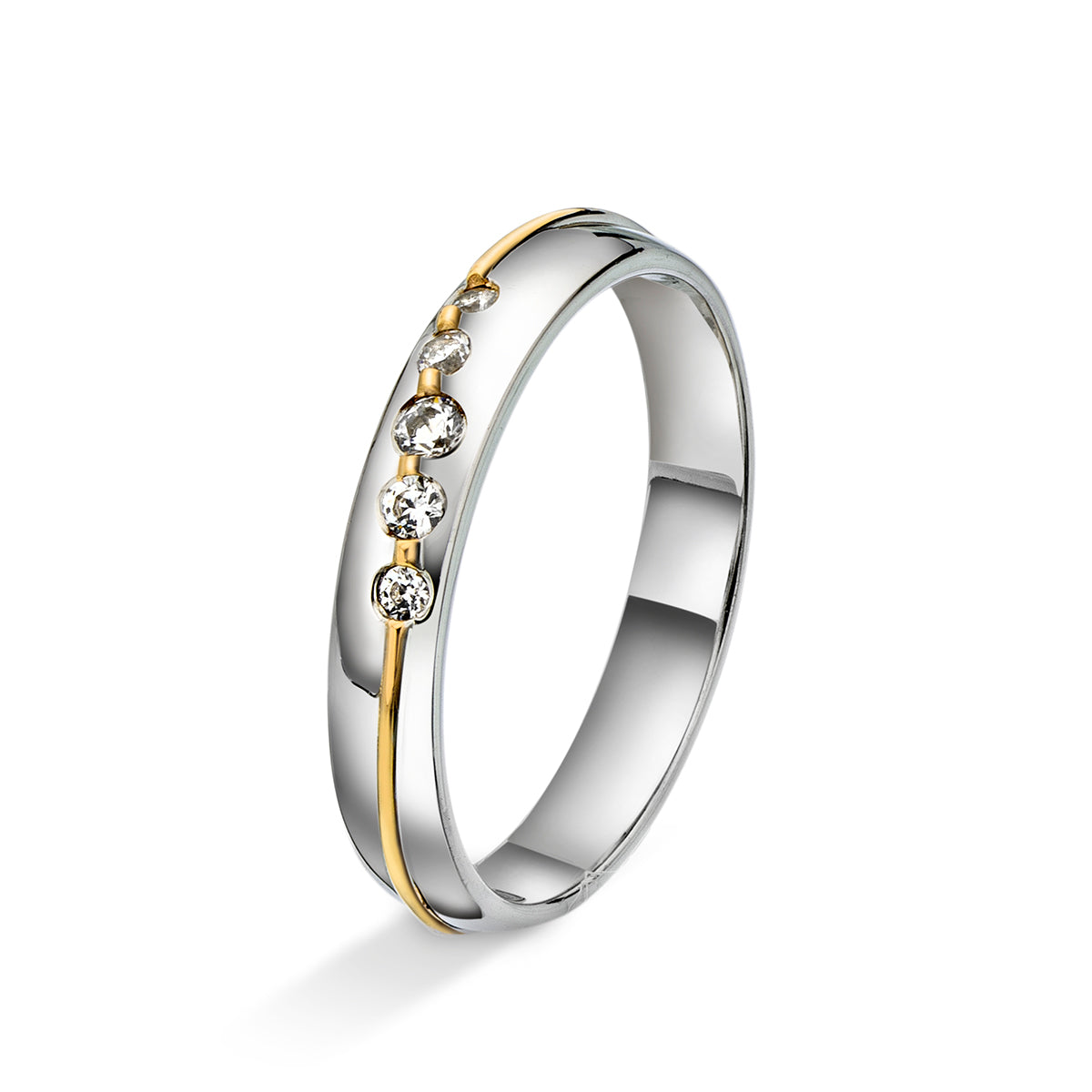 Giftering i 14 karat (585) tofarget gull med en bredde på 3,5mm og diamanter på totalt 0,14ct. Ringen kombinerer hvitt og gult gull i et harmonisk design, hvor en elegant gulldetalj følger ringen diagonalt og løfter frem fem glitrende diamanter. Den unike plasseringen av stenene gir et moderne preg samtidig som den bevarer et klassisk uttrykk. Dette er en ring som symboliserer varighet, eleganse og kjærlighet – perfekt til å markere et livsløfte. Ønsket gravering medfølger kostnadsfritt.