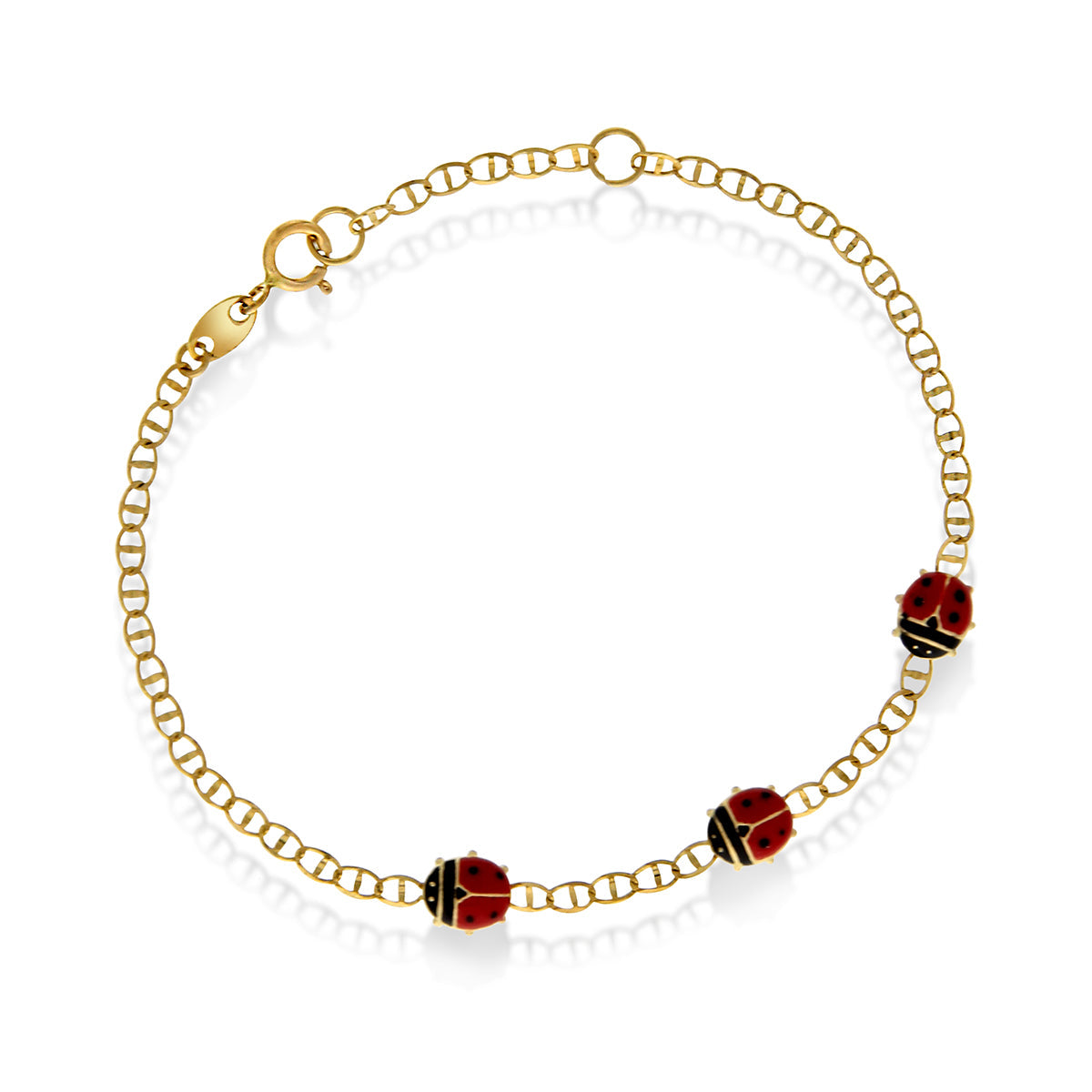 Flott 14k (585) armbånd i gult gull og emalje, med marihønemoitv. Dette passer perfekt til barn, og som gave til dåp eller navnedag.