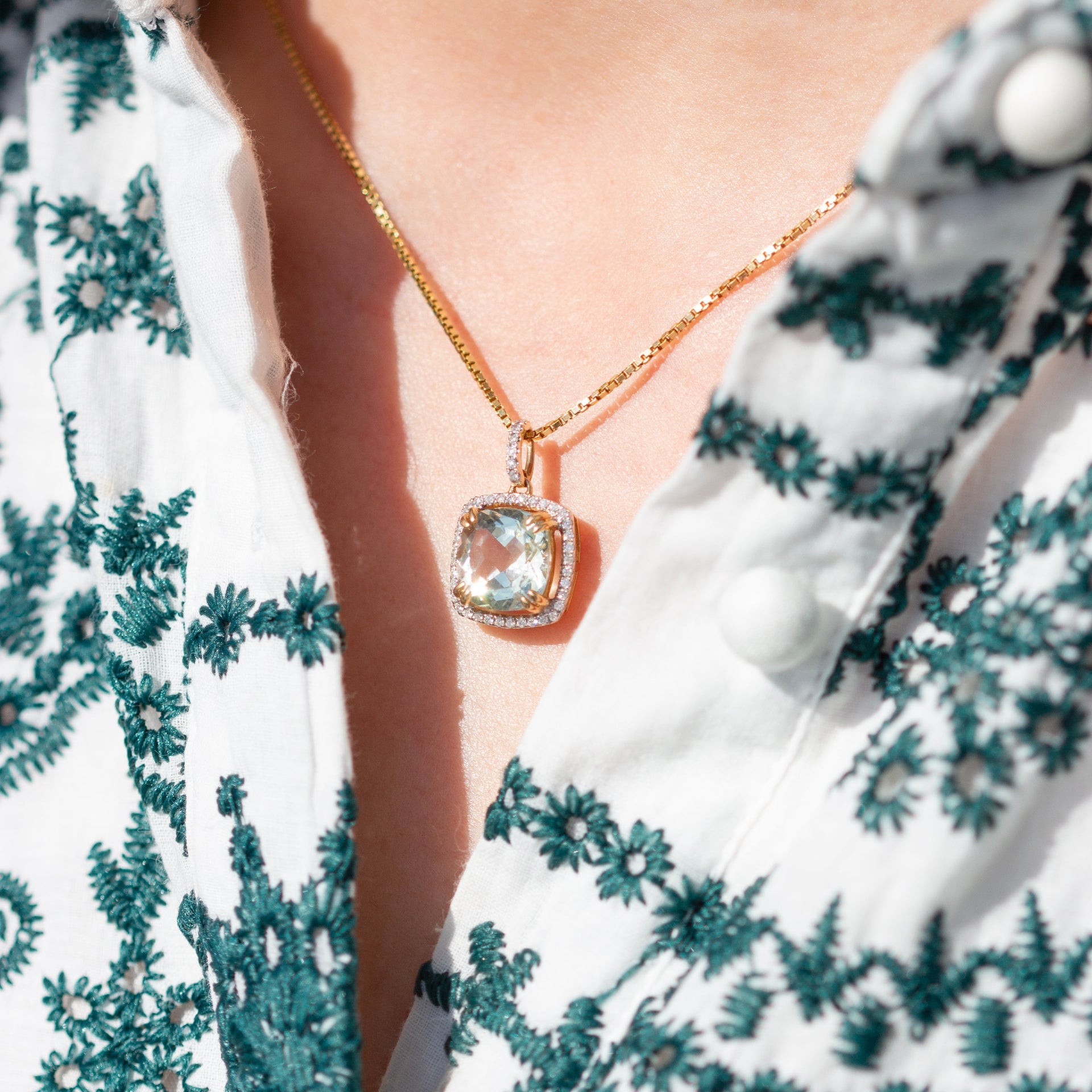 Eksklusivt anheng i 14 karat gult gull med en vakker grønn ametyst på hele 4.10 ct. Den firkantede ametysten er omkranset av 0.20 ct glitrende diamanter i kvalitet TW/SI, som gir smykket et luksuriøst og tidløst uttrykk. Perfekt som et blikkfang alene, eller kombinert med matchende ring og ørepynt for en komplett look.