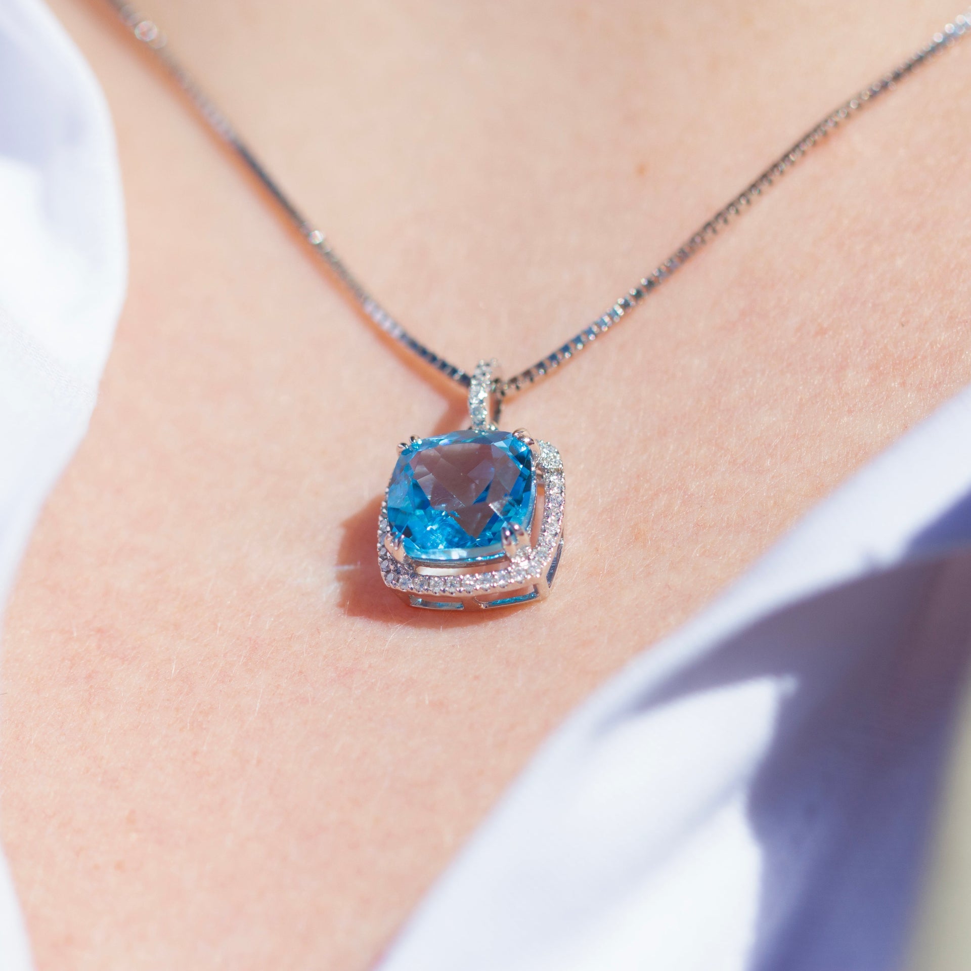 Elegant anheng i 14 karat hvitt gull, med en nydelig blå topas på 4.10 ct i sentrum. Den klare blå stenen gir et friskt og luksuriøst uttrykk, vakkert rammet inn av 0.20 ct glitrende diamanter i kvalitet TW/SI. Et tidløst smykke som passer perfekt både til hverdagsbruk og spesielle anledninger – like flott alene som sammen med matchende ring og øredobber.