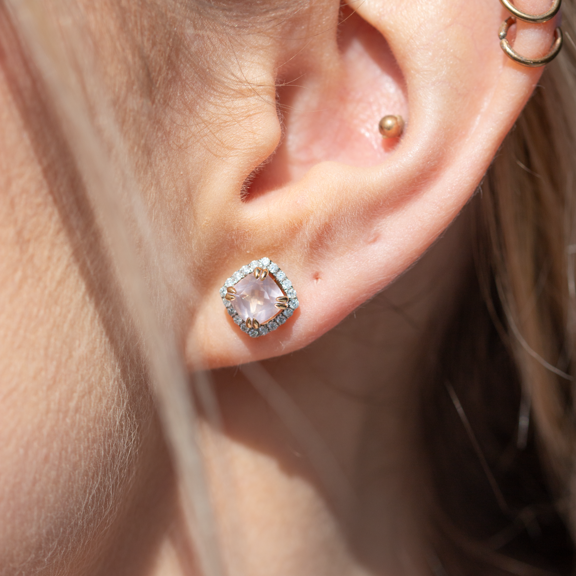 Strålende ørepynt i 14 karat gult gull med et elegant og friskt uttrykk. De store rosekvartsene på tot. 2.10 ct er midtpunktet i designet og omkranses av totalt 0.30 ct glitrende diamanter i kvalitet TW/SI. Kombinasjonen av den myke rosafargen og det varme gullet gir et eksklusivt, men samtidig lekent preg som passer like godt til hverdag som til fest. En tidløs ørepynt med et snev av farge som løfter ethvert antrekk.
