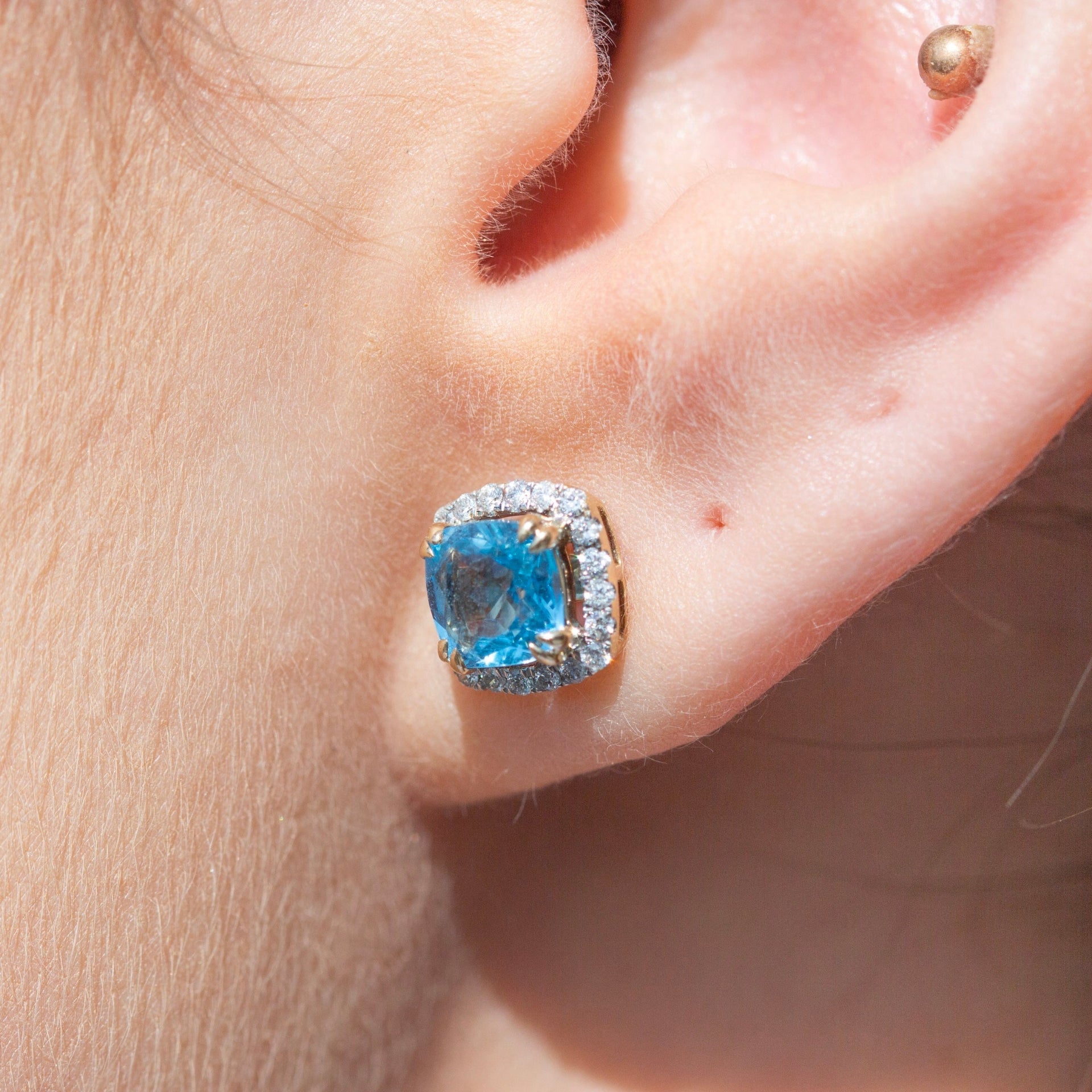 Elegant ørepynt i 14 karat gult gull med strålende blå topas på tot. 2.10 ct som blikkfang. Rundt stenen ligger en ramme av totalt 0.30 ct glitrende diamanter i kvalitet TW/SI, som gir ekstra liv og dybde til det klare blå uttrykket. En lekker kombinasjon av farge og glans – perfekt for deg som ønsker et smykke med det lille ekstra, enten til fest eller som en fargerik detalj i hverdagen.