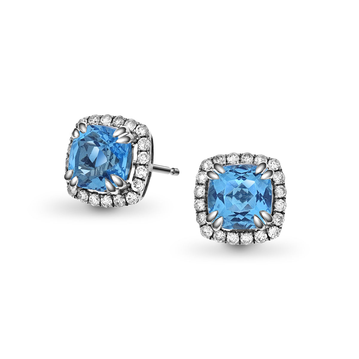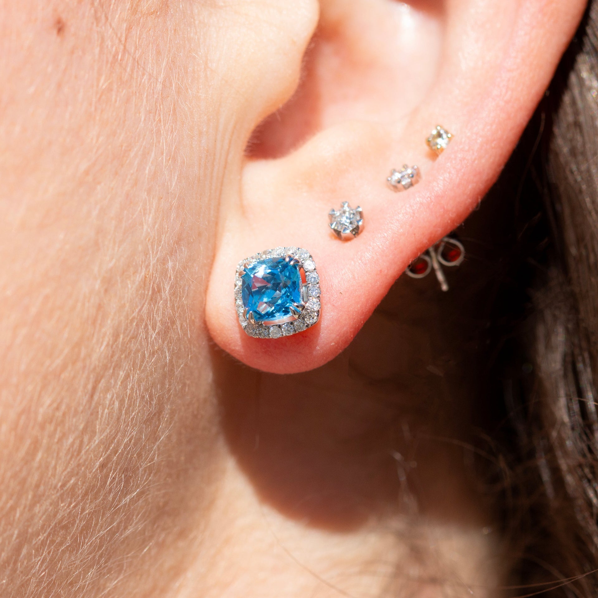 Lekker ørepynt i 14 karat hvitt gull, med gnistrende blå topaser på tot. 2.10 ct som hovedsten. Rundt topasen ligger en elegant ramme av diamanter på totalt 0.30 ct i kvalitet TW/SI, som gir smykket et eksklusivt og tidløst uttrykk. Perfekt for deg som ønsker et sofistikert blikkfang med frisk farge og klassisk glans. Matcher like godt til festantrekket som til hverdagsfavorittene.