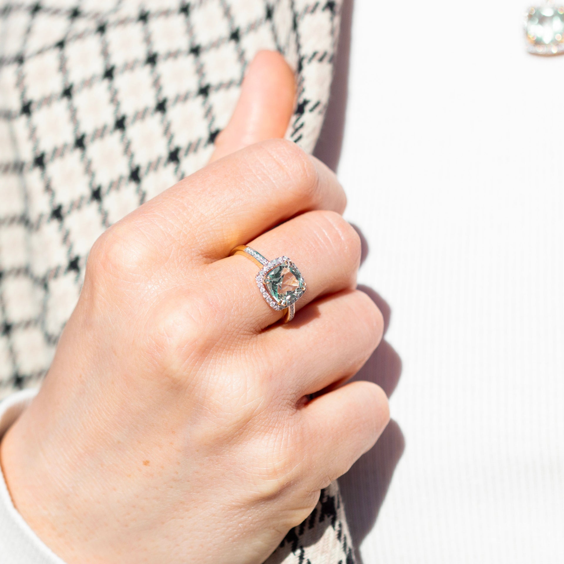 Elegant ring i 14 karat gult gull, med en vakker grønn ametyst på 2.40 ct som midtpunkt. Rundt hovedstenen ligger en glitrende ramme av diamanter på totalt 0.30 ct i kvalitet TW/SI, som gir ringen et eksklusivt og tidløst preg. En perfekt kombinasjon av farge og glans – like fin alene som sammen med matchende smykker for et helhetlig uttrykk.