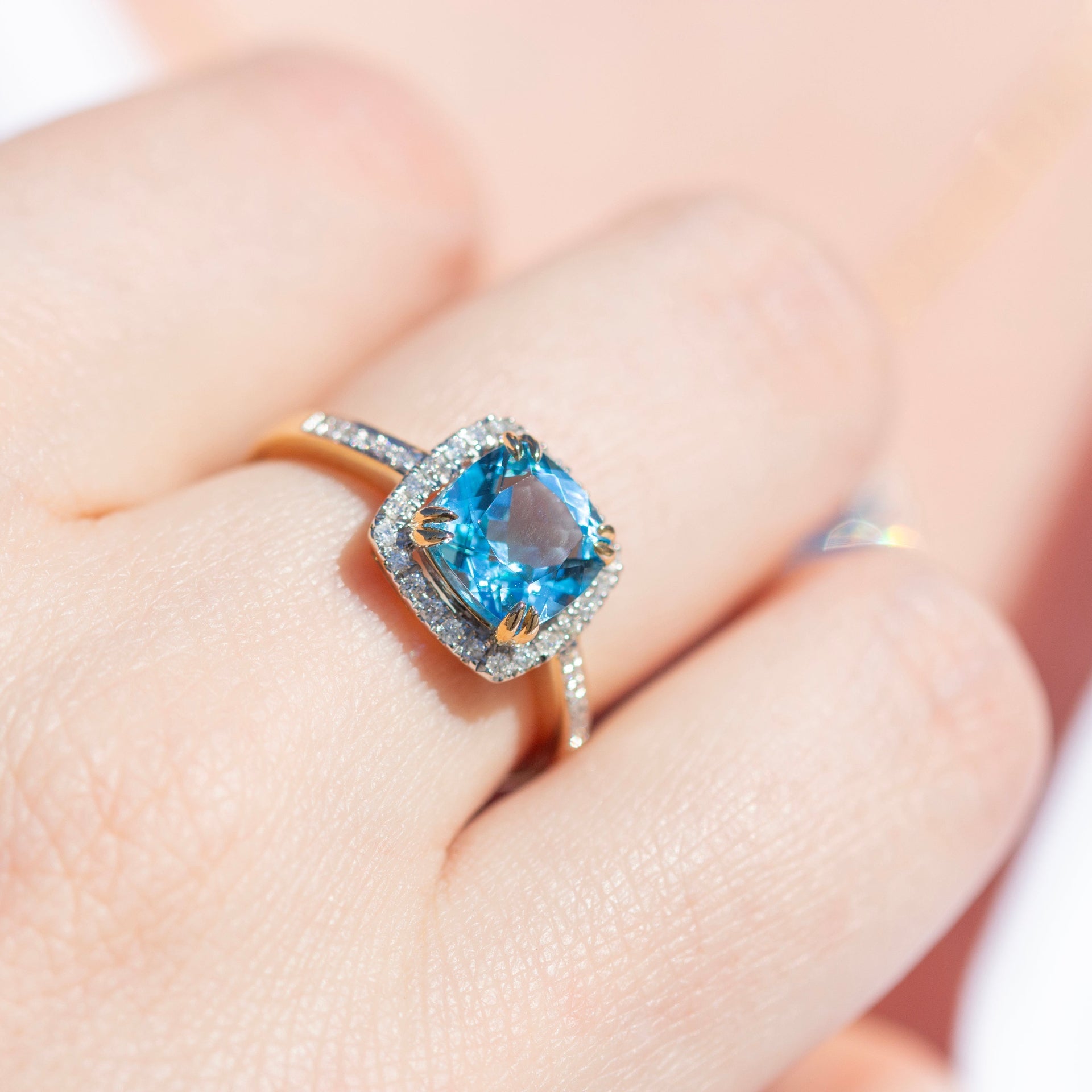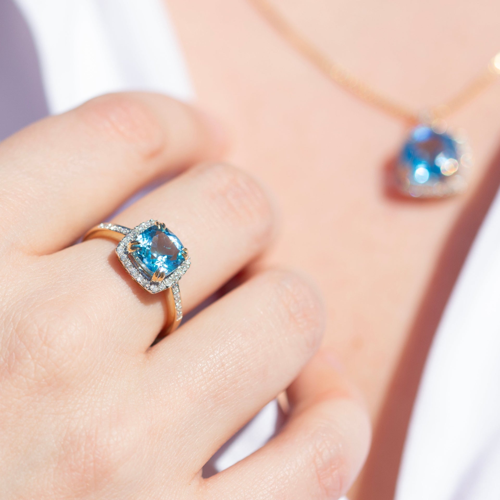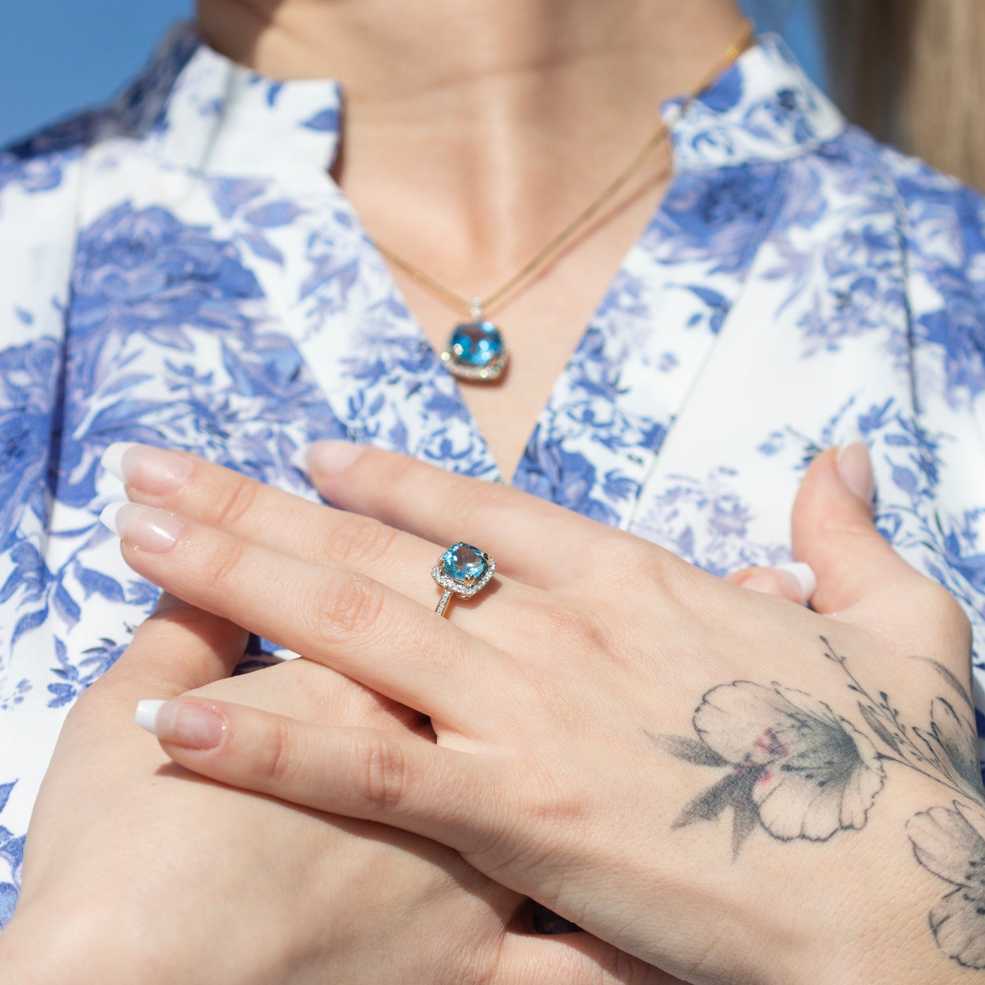 Eksklusiv ring i 14 karat gult gull med en strålende blå topas på 2.40 ct som midtpunkt. Den levende blå stenen fanges vakkert opp av en glitrende ramme med diamanter på totalt 0.30 ct TW/SI. En ring som kombinerer klassisk eleganse med et friskt og moderne uttrykk. Matcher perfekt med tilhørende anheng og ørepynt for en komplett stil.