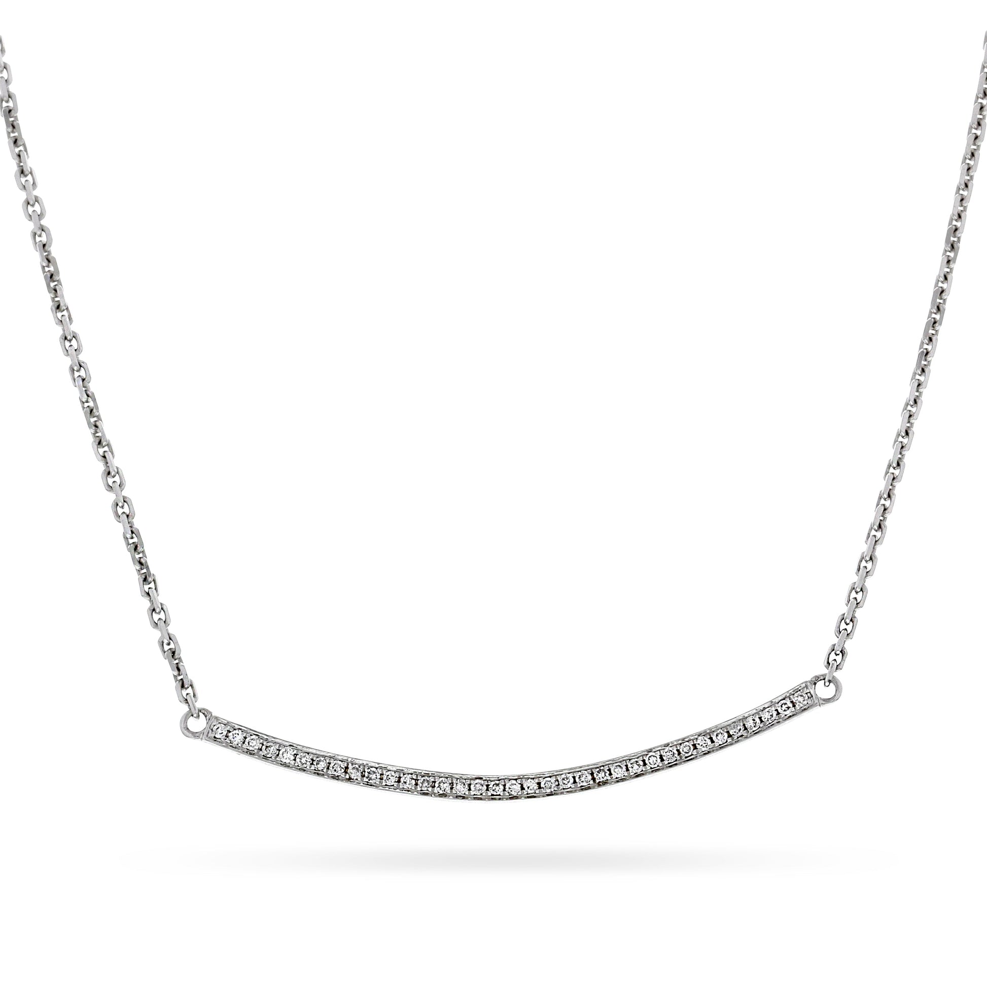 Eksklusivt collier-halssmykke i 14 karat gult eller hvitt gull med 0.20 ct TW/SI diamanter. Den buede stangen foran er fattet med en rekke brillantslipte diamanter som gir et raffinert uttrykk med imponerende glans. Det slanke designet gjør smykket både tidløst og lett å kombinere med andre halskjeder for en personlig stil. En elegant gaveidé – eller en selvsagt investering i egen smykkesamling.