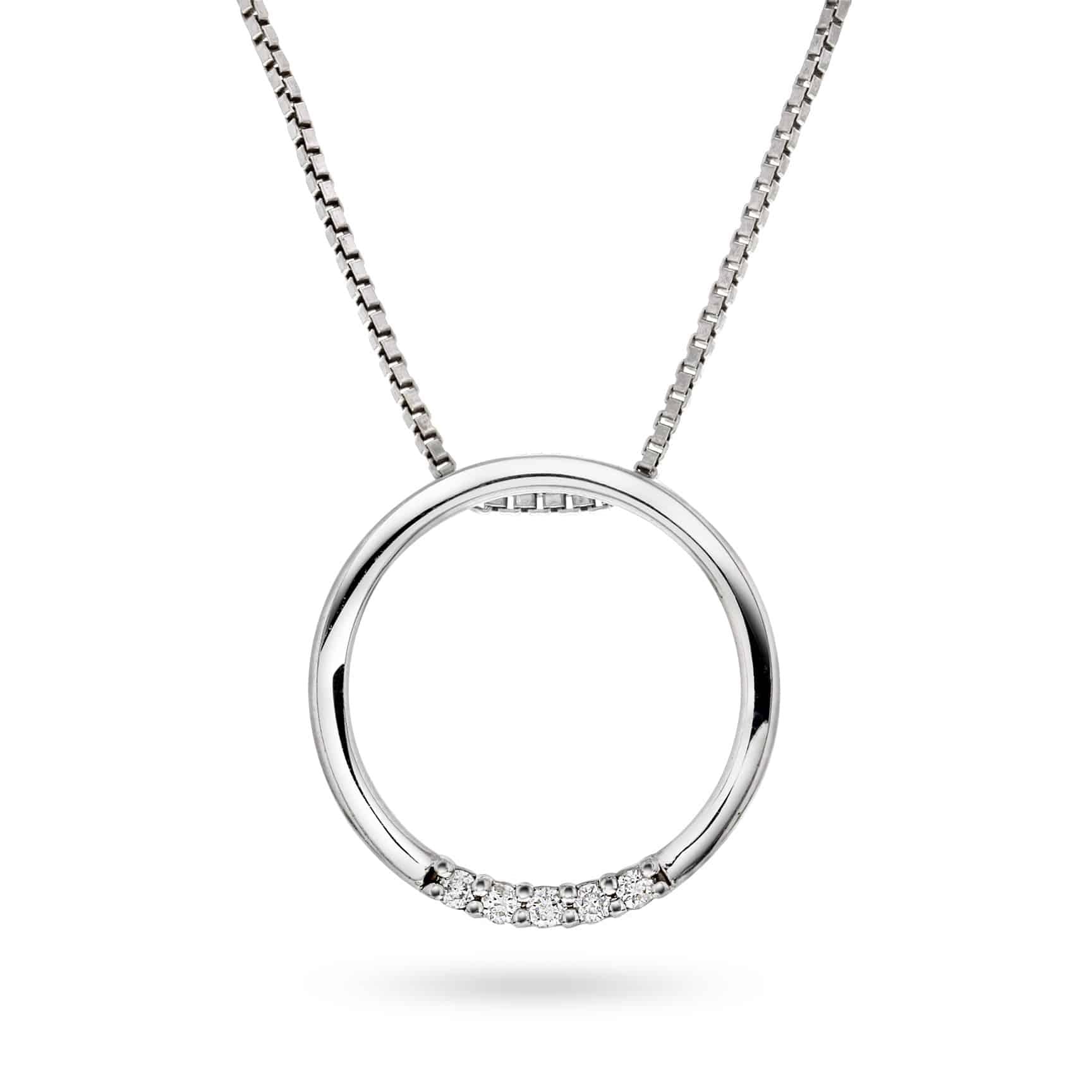 Elegant sirkelanheng i gult gull, prydet med 0.10 ct glitrende diamanter. Det åpne designet skaper et lett og moderne uttrykk, mens de nøye innfattede diamantene gir anhenget en subtil glans. Perfekt alene for et minimalistisk preg, eller kombinert med andre smykker for et personlig uttrykk. Et tidløst design som enkelt løfter ethvert antrekk.