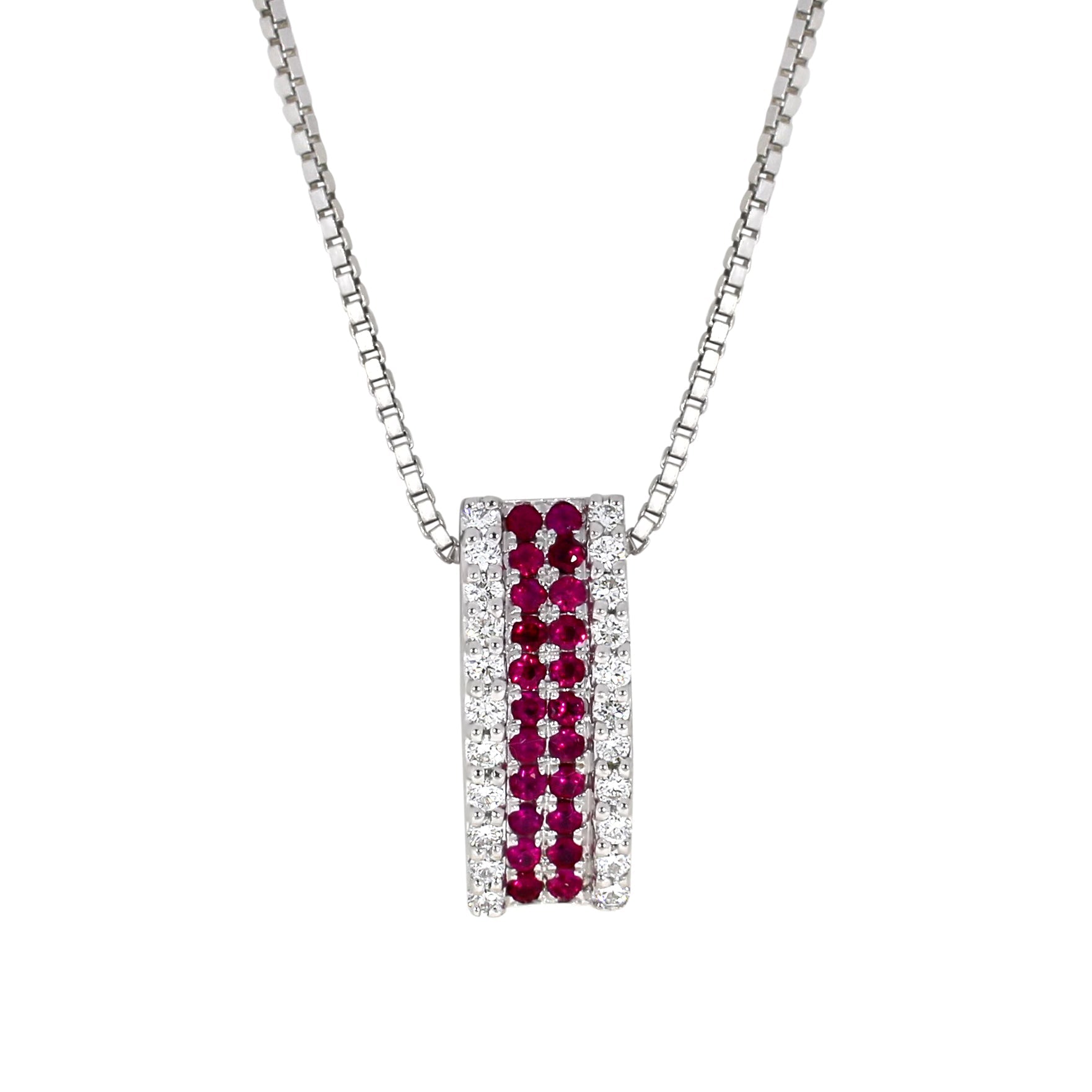 Elegant diamantanheng i 14 karat hvitt gull med 0.30 ct TW/SI diamanter og glødende rubiner.
