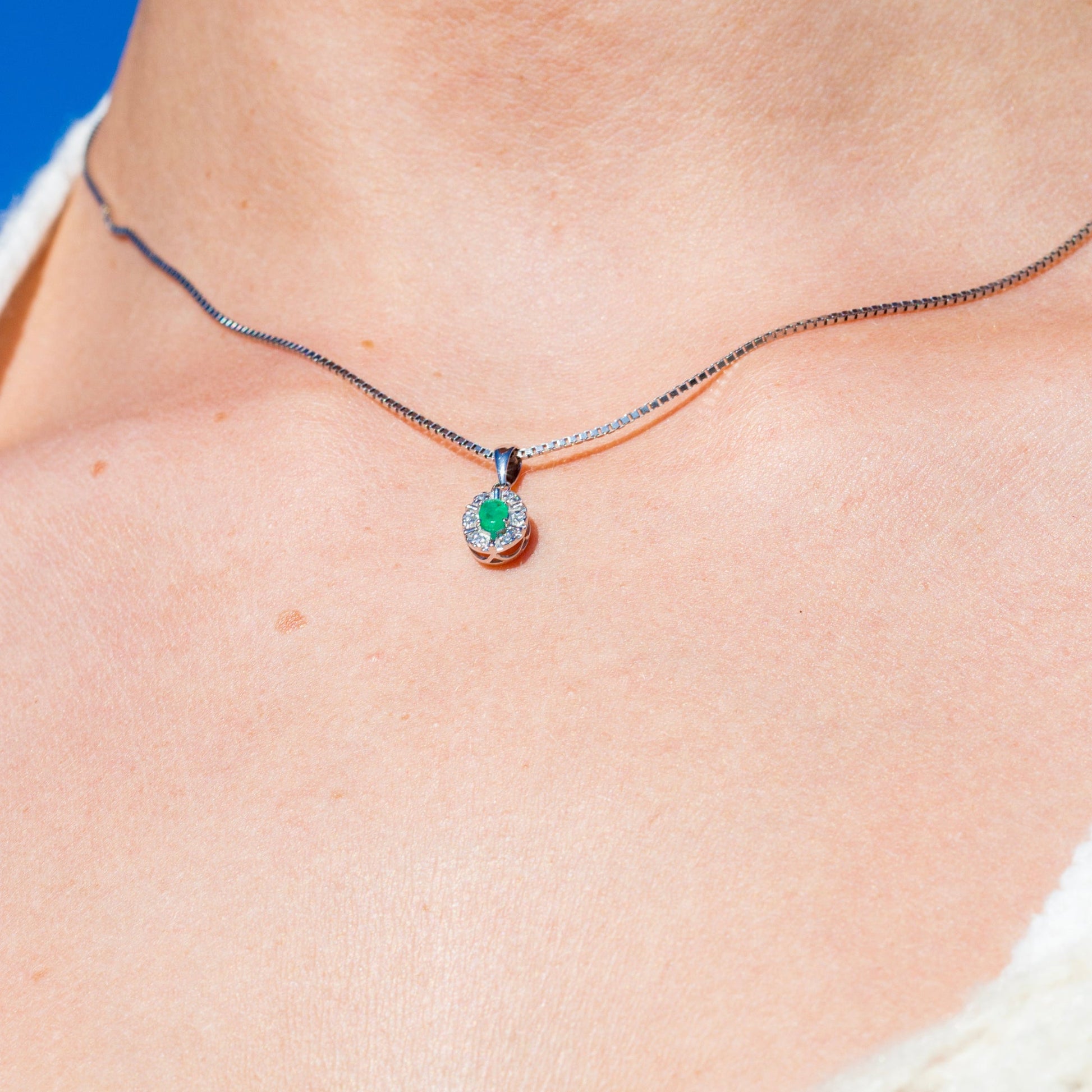 Frisk og elegant – dette anhenget i hvitt gull prydes av en naturlig smaragd omgitt av 0.03 ct glitrende diamanter. Den livlige grønne fargen gir smykket en unik karakter og et eksklusivt uttrykk. Perfekt for deg som vil tilføre et fargesterkt blikkfang til antrekket. En tidløs favoritt som løfter enhver stil.