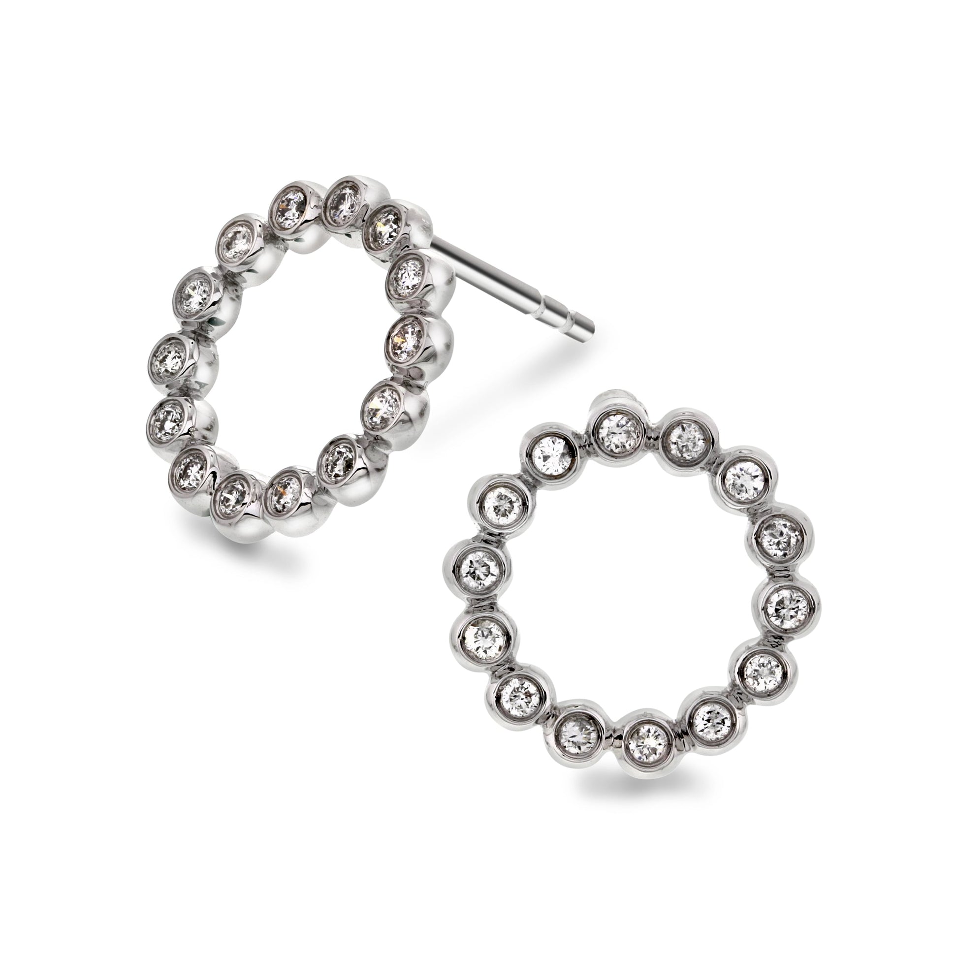 Delikate øredobber i hvitt gull med sirkelformet design prydet av briljantslipte diamanter på totalt 0.25 ct. Diamantene er elegant fattet i små runde rom som følger formen og gir en glitrende helhet med myk struktur. Formen gir et moderne uttrykk med klassisk eleganse.