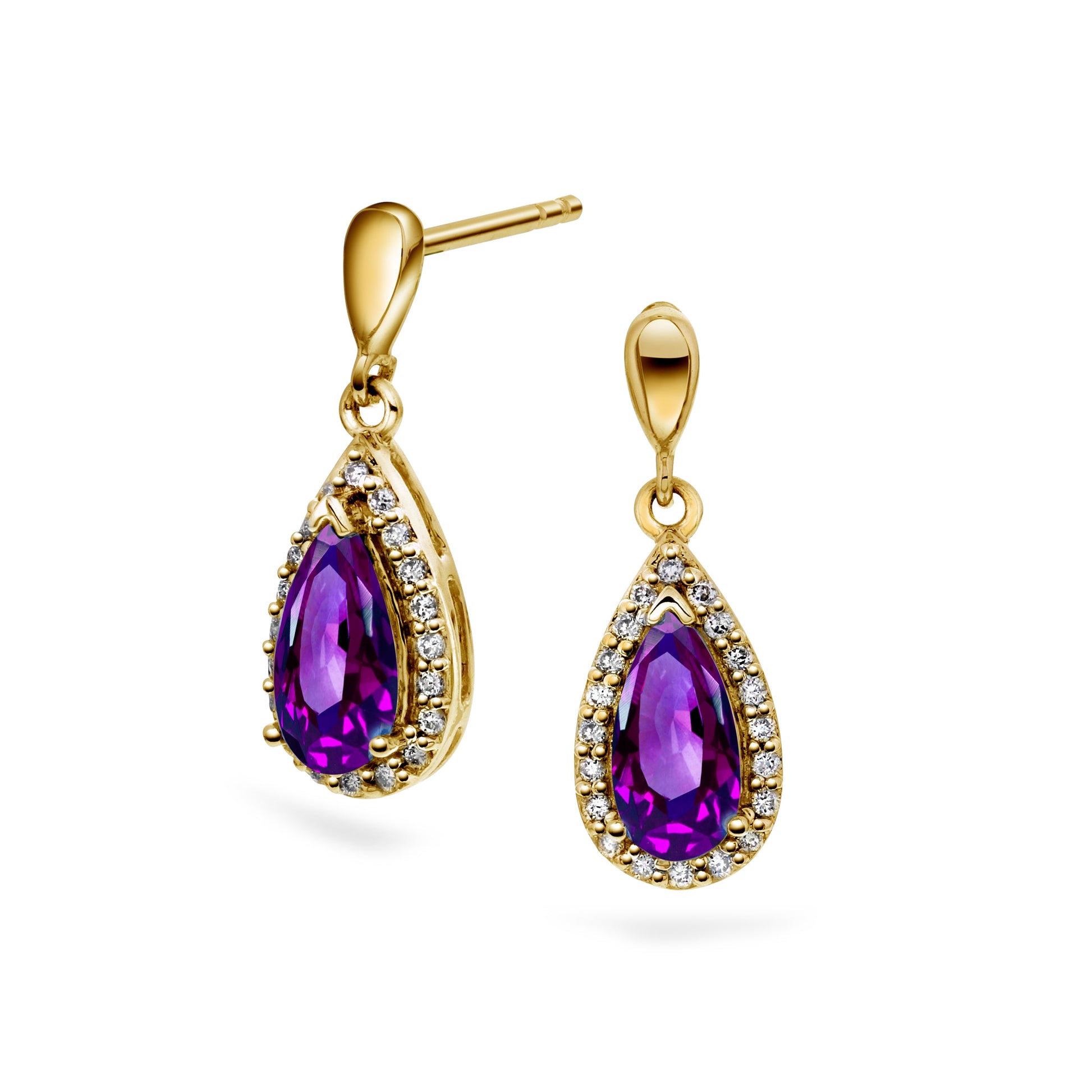 Elegant ørepynt i 14 karat gult eller hvitt gull med dråpeformet ametyst, innrammet av 0.20 ct TW/SI diamanter. Edelstenens dype lillafarge får nytt liv i kontrast til diamantene og metallets glans. Det slanke opphenget gir smykket bevegelse og letthet. Et klassisk design med høy visuell effekt.