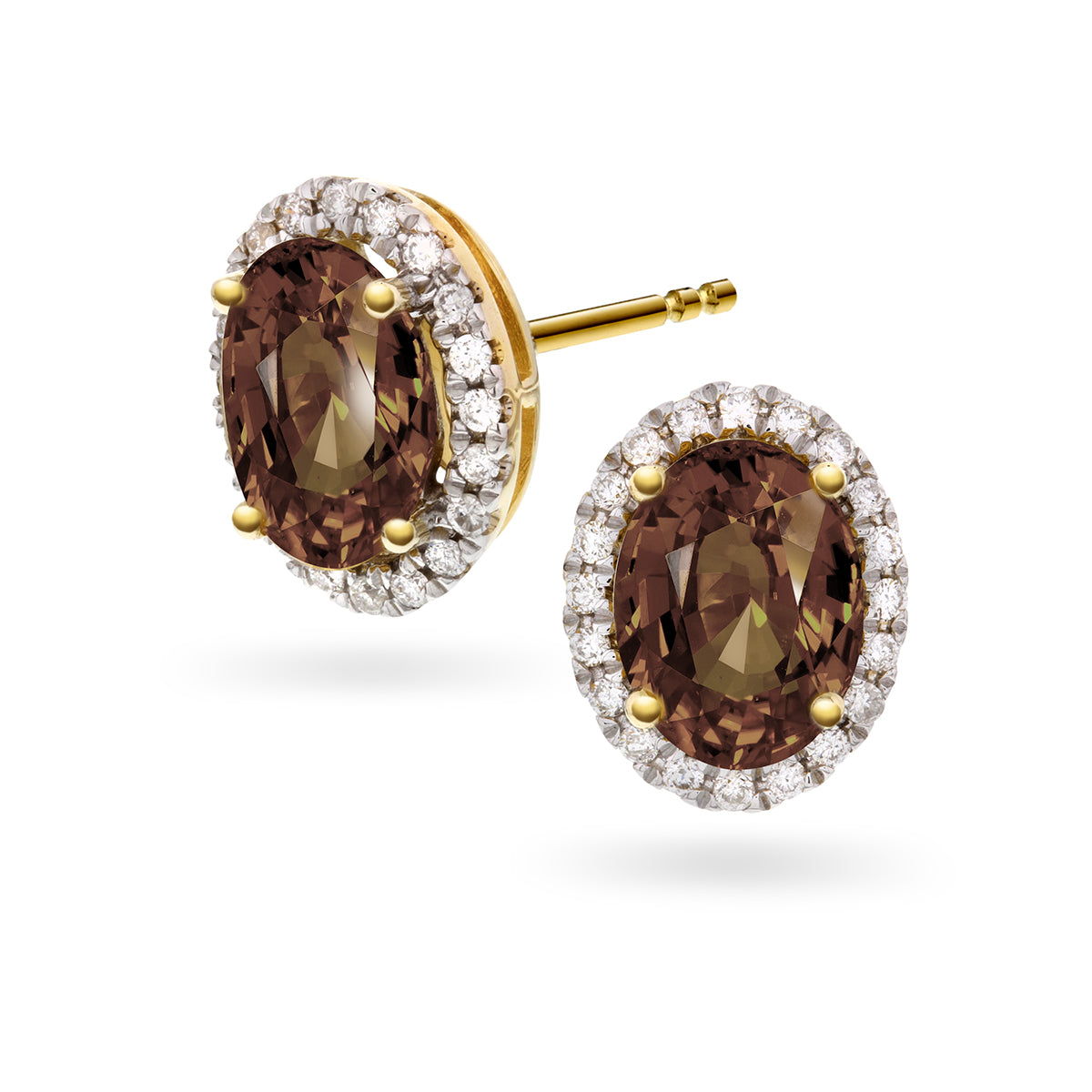 Elegant diamantørepynt i 14 karat gult gull med ovale røykkvartser på 1.50 ct og 0.20 ct TW/SI diamanter. Den dype bruntonen i edelstenen gir smykket et jordnært og sofistikert uttrykk, mens diamantene tilfører glans og kontrast. Formen fremhever stenenes naturlige glød og gir et balansert og luksuriøst uttrykk.