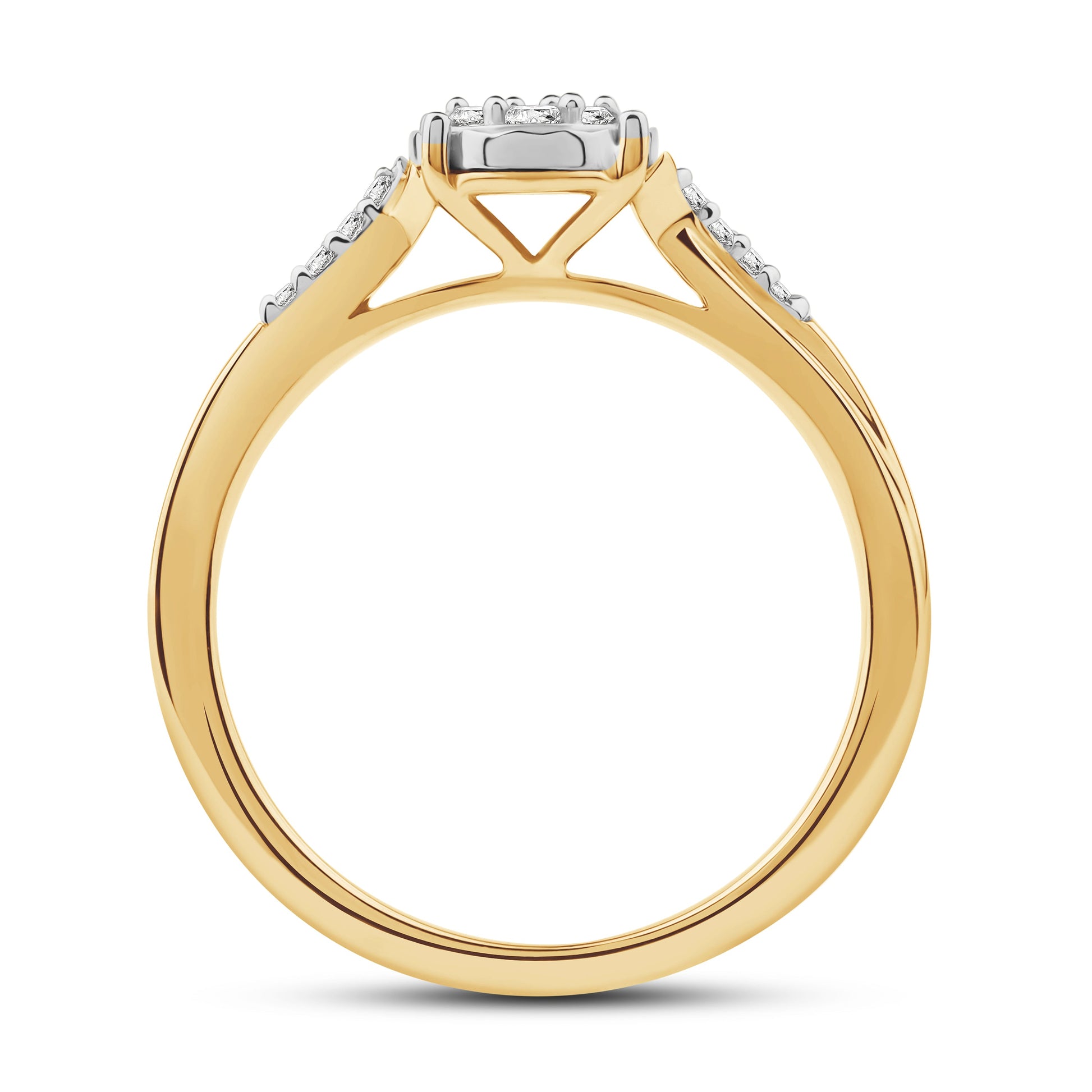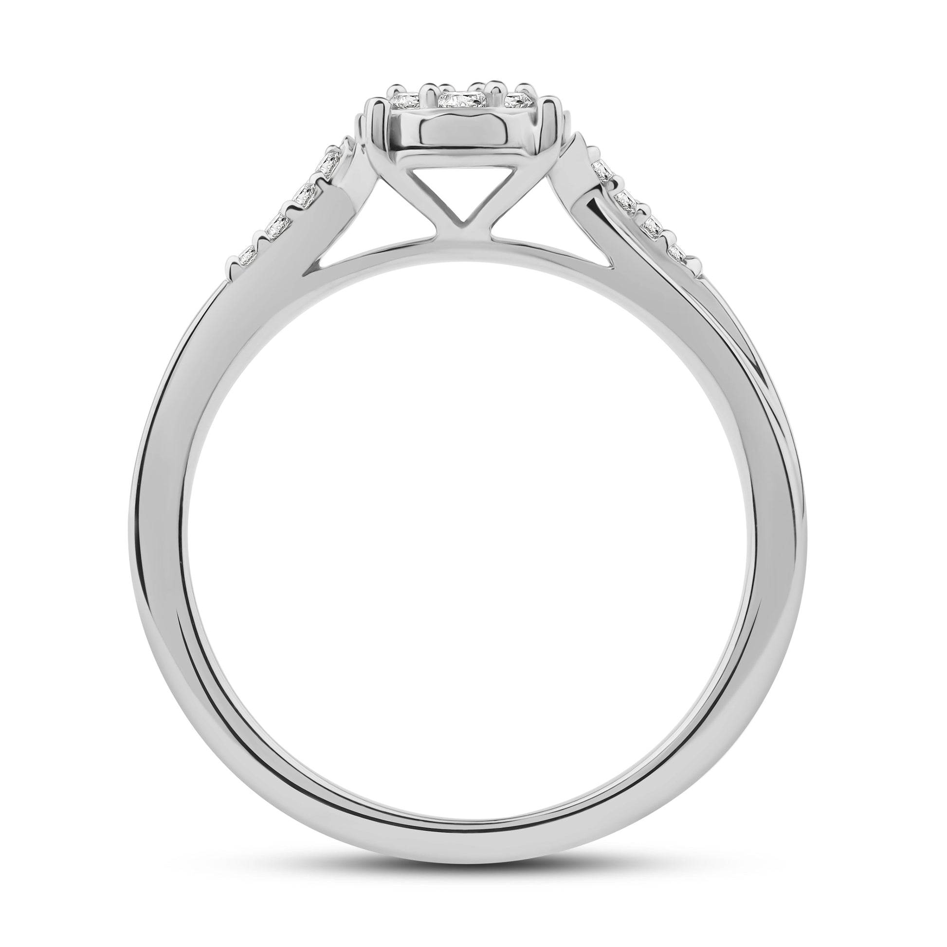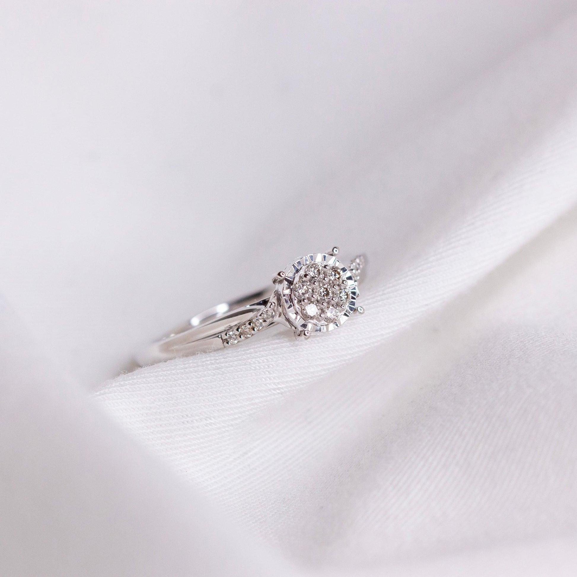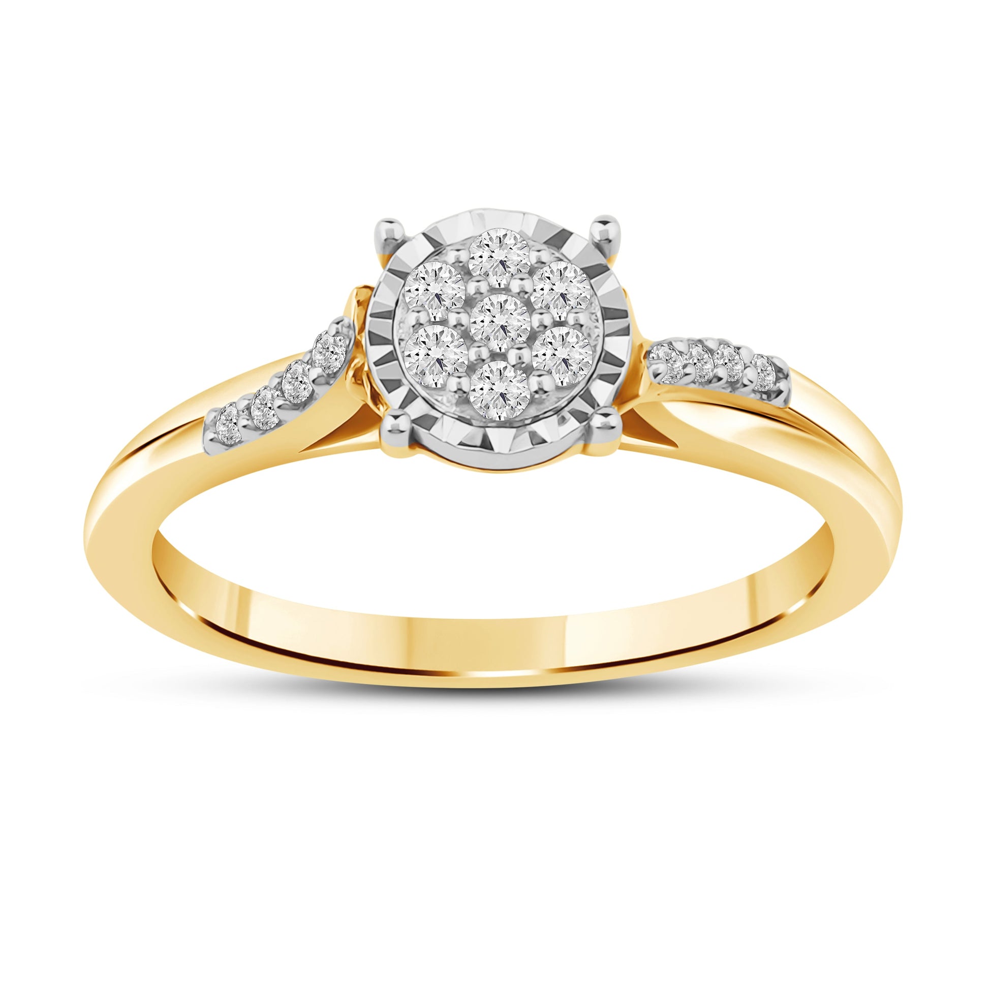 Tidløs diamantring i 14 kt hvitt eller gult gull, utsmykket med 0.15 ct TW/SI diamanter. Midtpartiet er dekorert med en rund rosett av glitrende diamanter, innrammet av en elegant fatning som fremhever lys og glans. Ringskinnen er prydet med ekstra diamanter som tilfører smykket en subtil, men luksuriøs detalj.