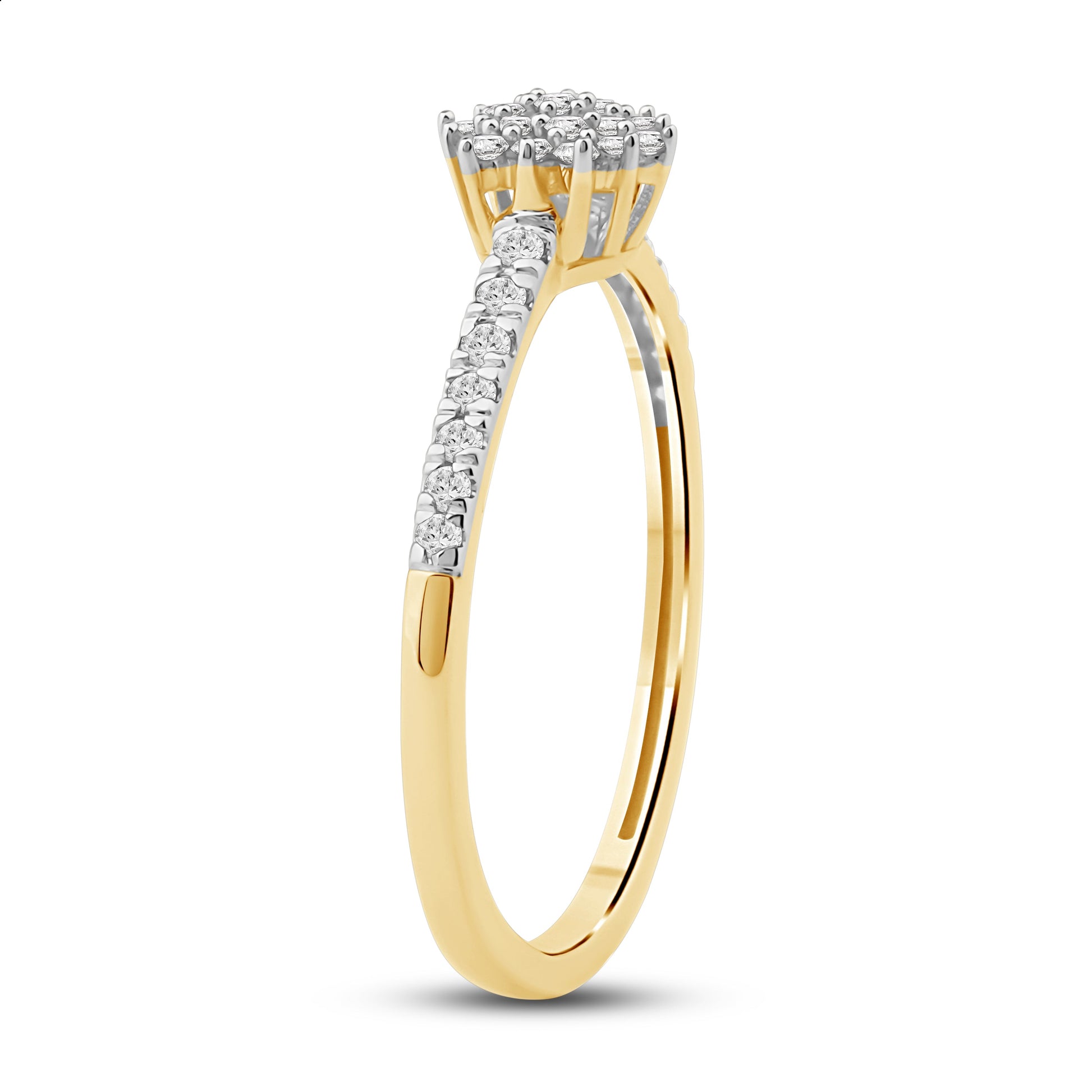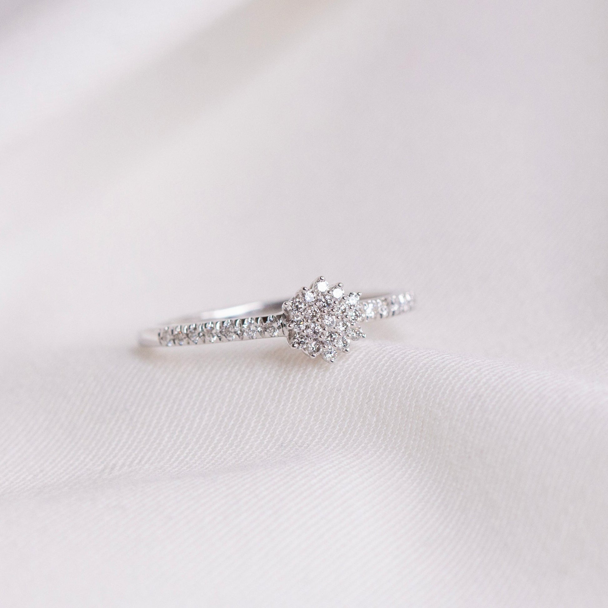 Eksklusiv diamantring i 14 kt gult eller hvitt gull, besatt med 0.22 ct TW/SI diamanter. Midtpartiet er utformet som en glitrende blomst av tett innfattede diamanter, mens ringskinnen er dekorert med ekstra steiner som fremhever ringens elegante glans. Kombinasjonen av klassisk gull og blendende diamanter gir smykket et tidløst og luksuriøst uttrykk.