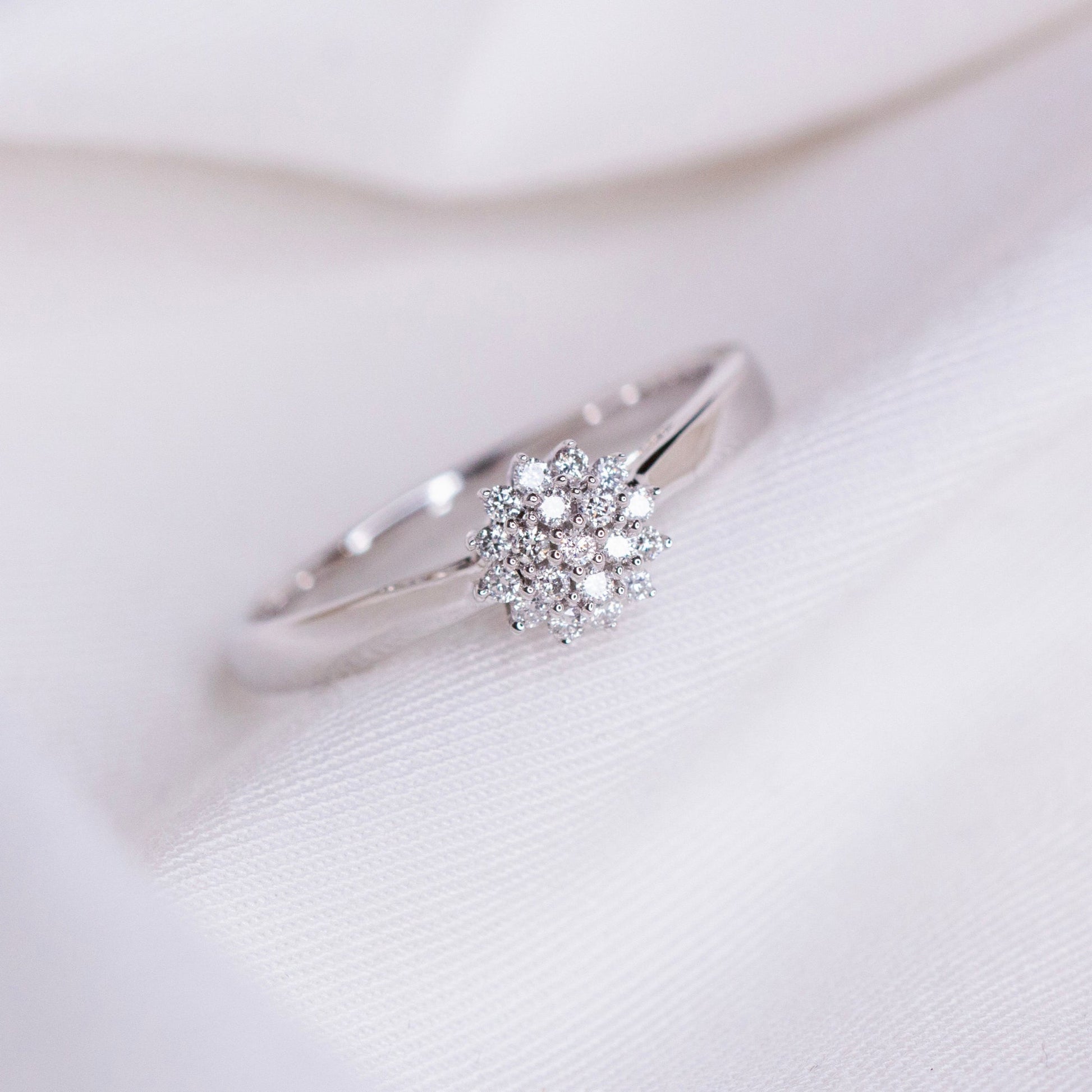 Elegant diamantring i 14 kt gult eller hvitt gull, besatt med 0.22 ct TW/SI diamanter. Midtpartiet er formet som en blomsterinspirert rosett med tett innfattede diamanter som gir et blendende og tidløst uttrykk. Den slanke ringskinnen i edelt gull fremhever midtpartiets glans og gjør ringen til et smykke som utstråler raffinement og luksus.