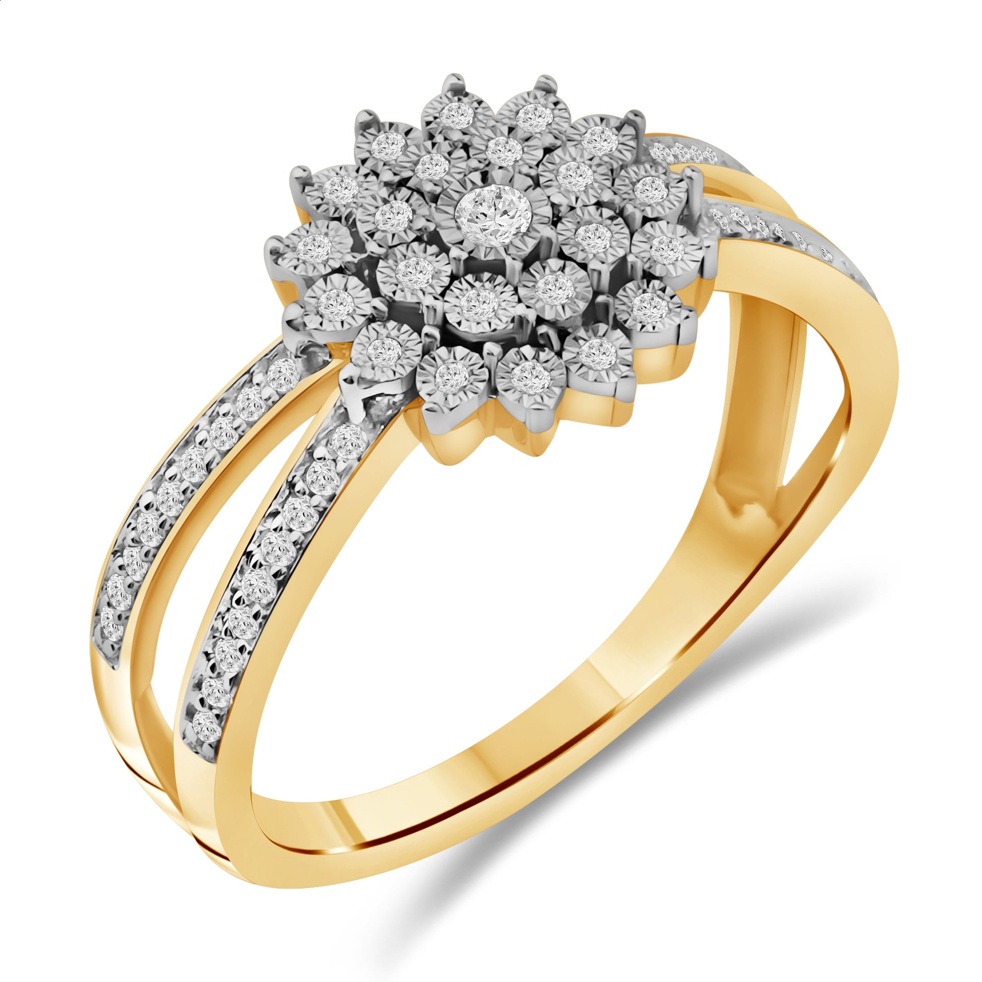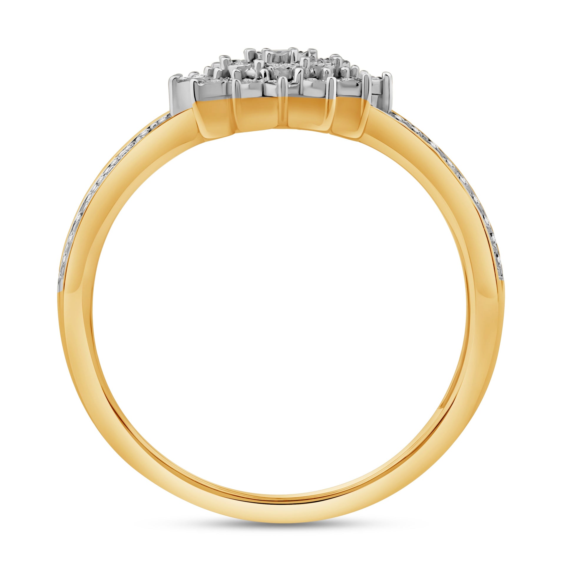 Luksuriøs diamantring i 14 kt gult eller hvitt gull, utsmykket med 0.22 ct TW/SI diamanter. Midtpartiet er utformet som en praktfull rosett med tett innfattede diamanter som skaper et blendende spill av lys. Den delte ringskinnen, dekorert med flere diamantrekker, gir ringen et ekstra eksklusivt uttrykk og fremhever dens tidløse eleganse.