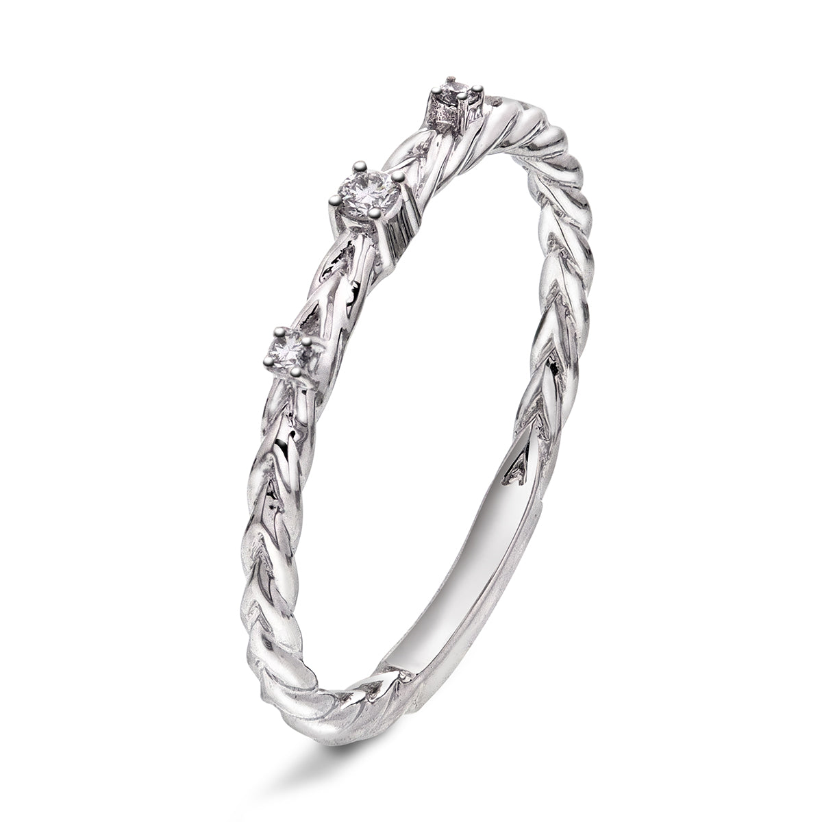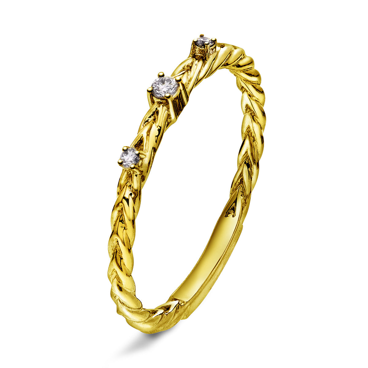 Tidløs ring i 14 karat gull med tre brillantslipte diamanter på totalt 0.05 ct. Den tvunnete ringskinnen gir et dekorativt og karaktersterkt uttrykk, mens diamantene tilfører et diskré glimt av luksus. En elegant kombinasjon av struktur og glans – perfekt alene eller i kombinasjon med andre ringer.
