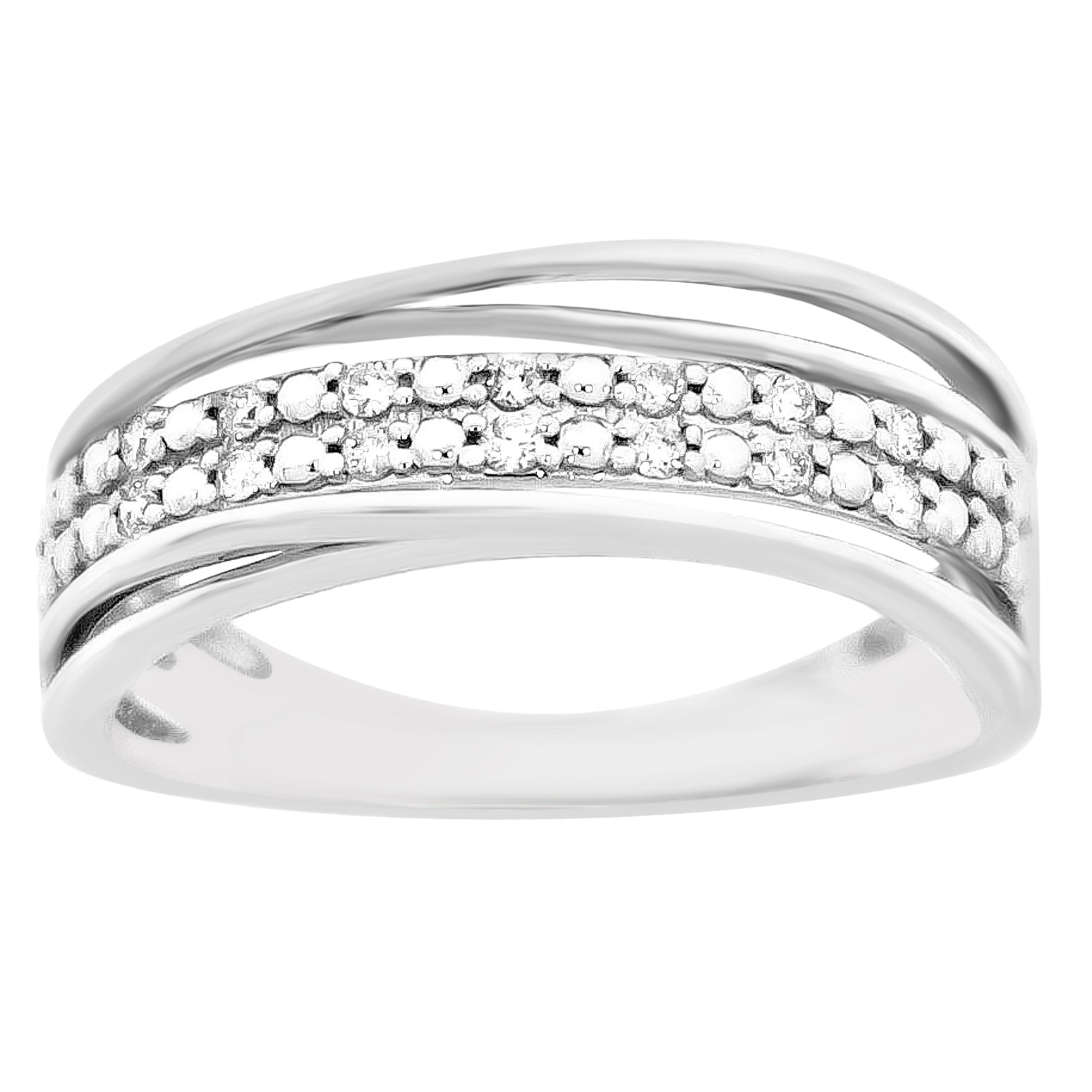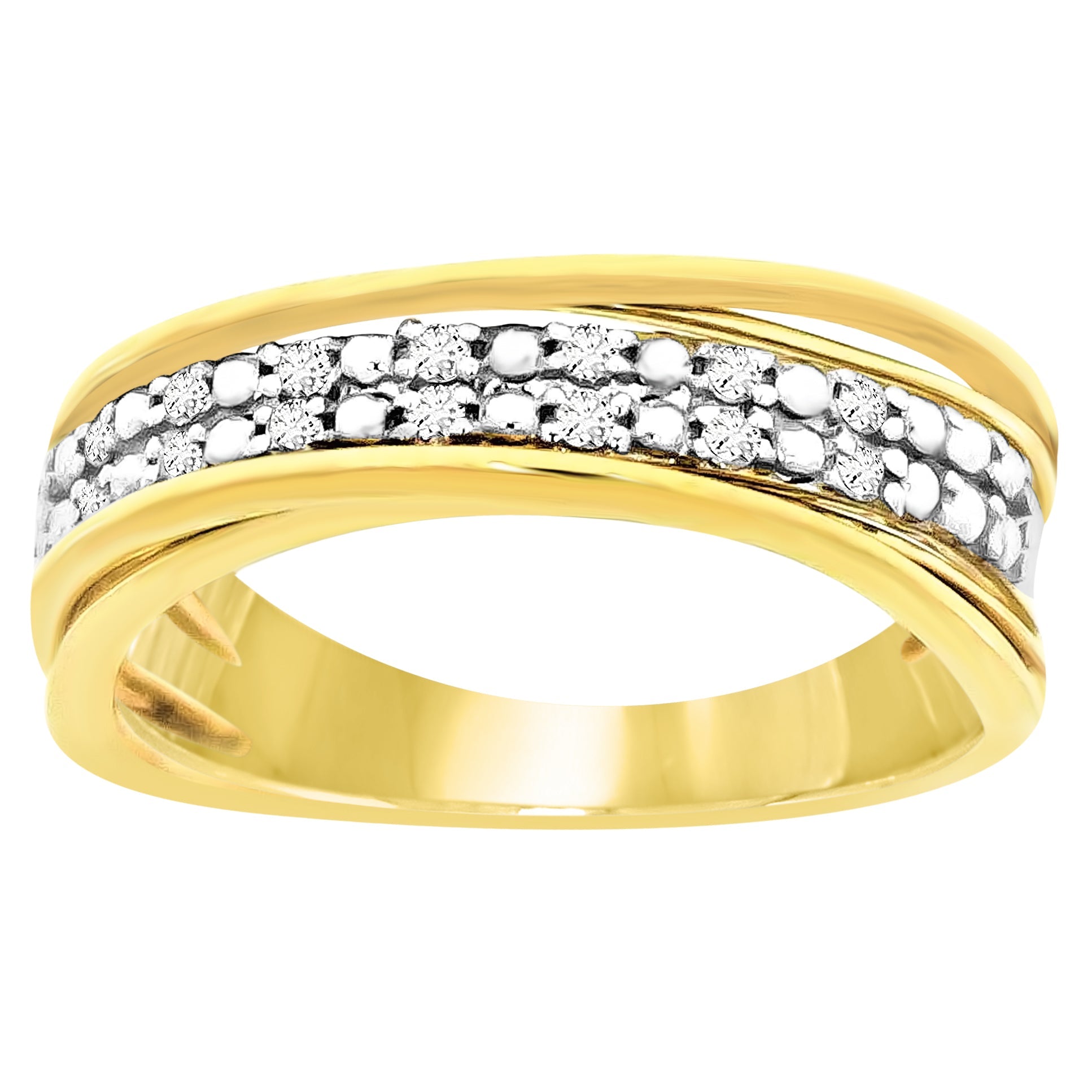 Sofistikert ring i 14 karat gull med et elegant, buet design og to rekker brillantslipte diamanter på til sammen 0.15 ct. De glitrende stenene er vakkert satt i en bred skinne som kombinerer linjer og struktur for et tidløst, men moderne uttrykk.