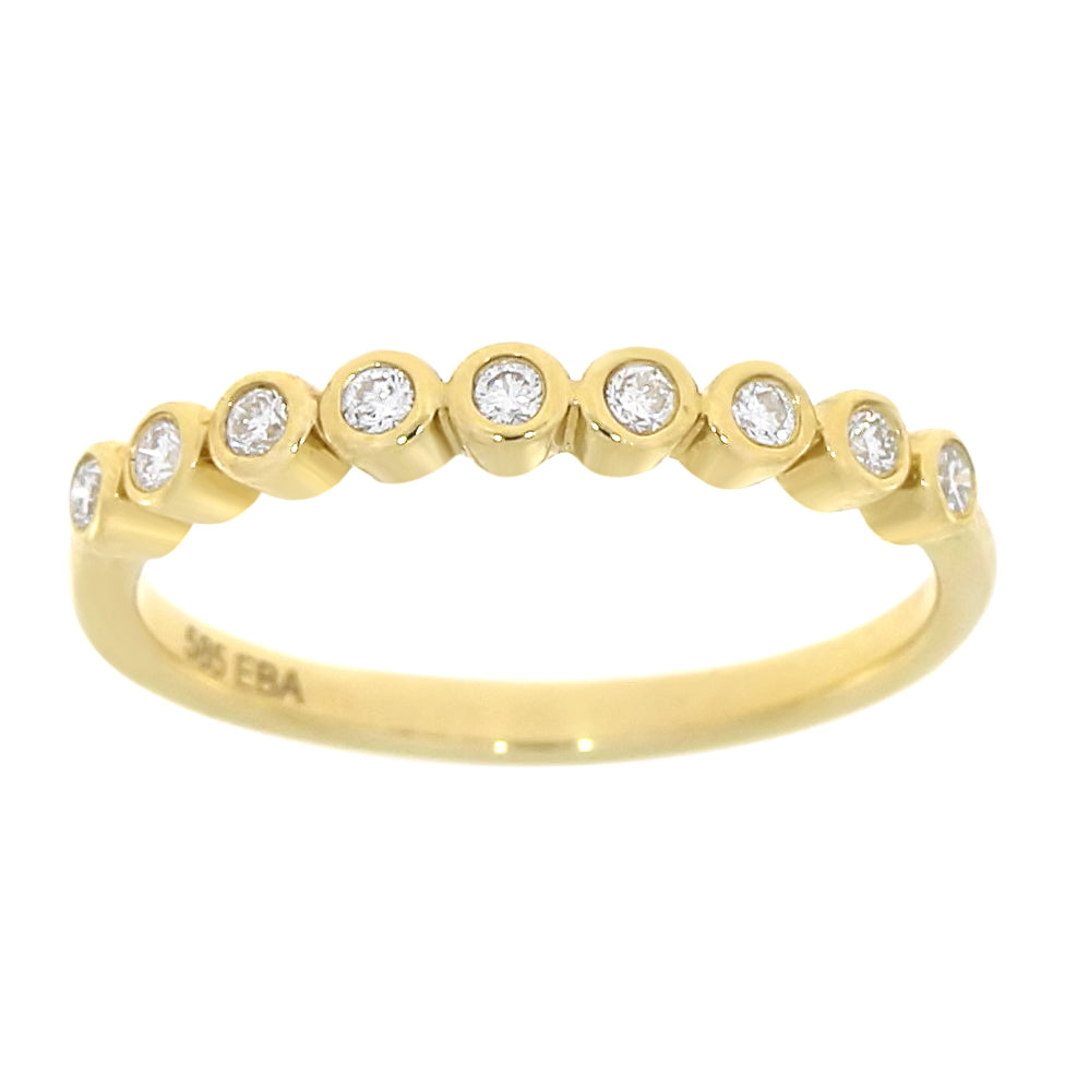 Elegant ring i gult eller hvitt gull med en harmonisk rekke diamanter som totalt utgjør 0.18 ct. De ni innfattede steinene er sirlig plassert i bezel-fatninger og følger ringens myke bue, noe som gir et delikat og moderne uttrykk. Designet kombinerer klassisk eleganse med en lett asymmetrisk rytme. Perfekt alene, eller i kombinasjon med andre ringer for en personlig stil.