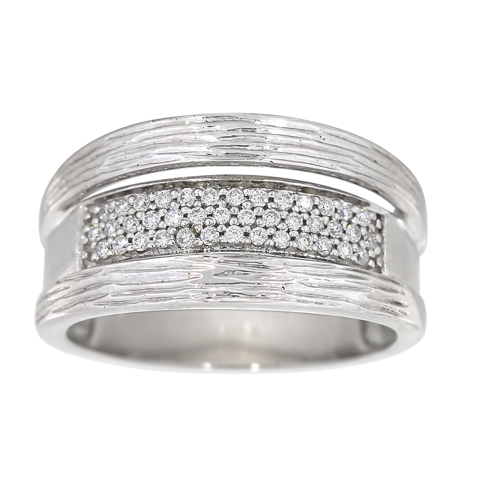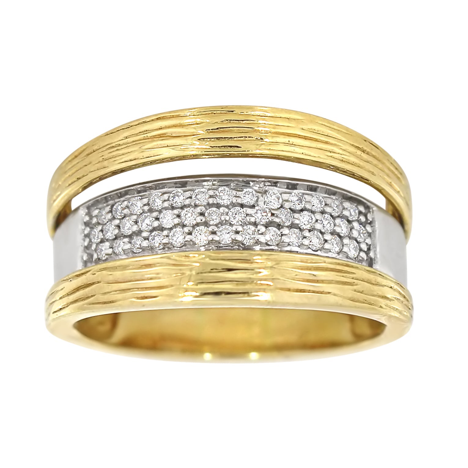 Luksuriøs ring i 14 karat gull med elegante diamantrekker innrammet av strukturert gull i børstet utførelse. Midtfeltet er pavébesatt med diamanter på totalt 0.25 ct, og skaper et blendende uttrykk med subtil dybde og karakter. Den brede formen kombinert med det taktile mønsteret gir ringen en moderne, men tidløs estetikk.