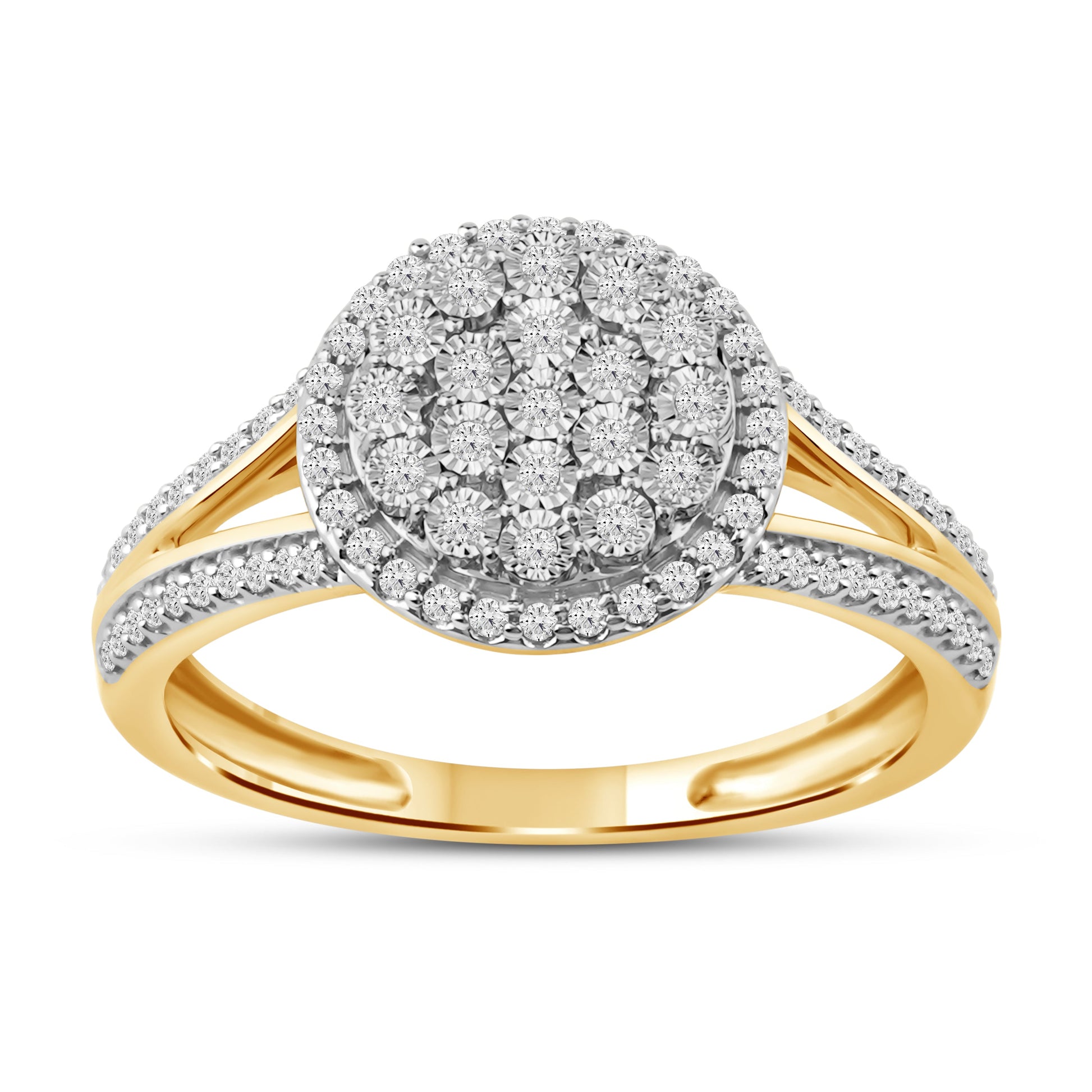 Strålende diamantring i 14 kt hvitt eller gult gull, utsmykket med 0.25 ct TW/SI diamanter. Midtpartiet er utformet med flere lag av tett innfattede diamanter i en rund setting som gir et imponerende spill av lys. Den delte ringskinnen, dekorert med ekstra diamantrekker, fremhever designets eksklusive preg og gjør ringen til et luksuriøst blikkfang.