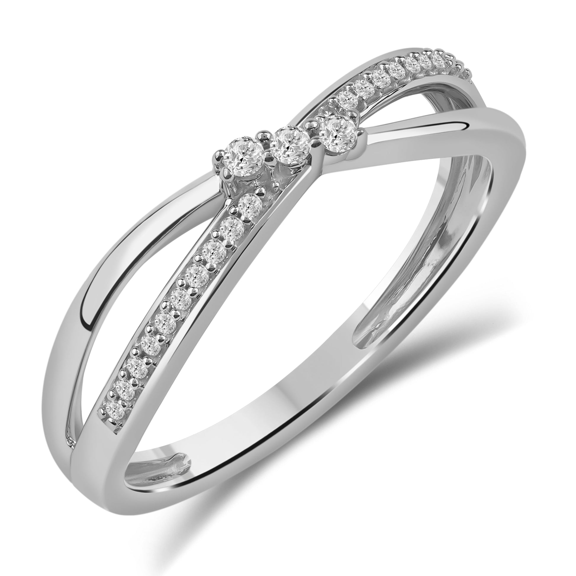 Elegant ring i 14 karat hvitt gull med en glitrende linje av små brillanter og tre større diamanter som møtes i midten i et vakkert og harmonisk samspill. Totalt 0.12 ct diamanter gir ringen et luksuriøst uttrykk, mens det asymmetriske designet gir en moderne og luftig følelse.