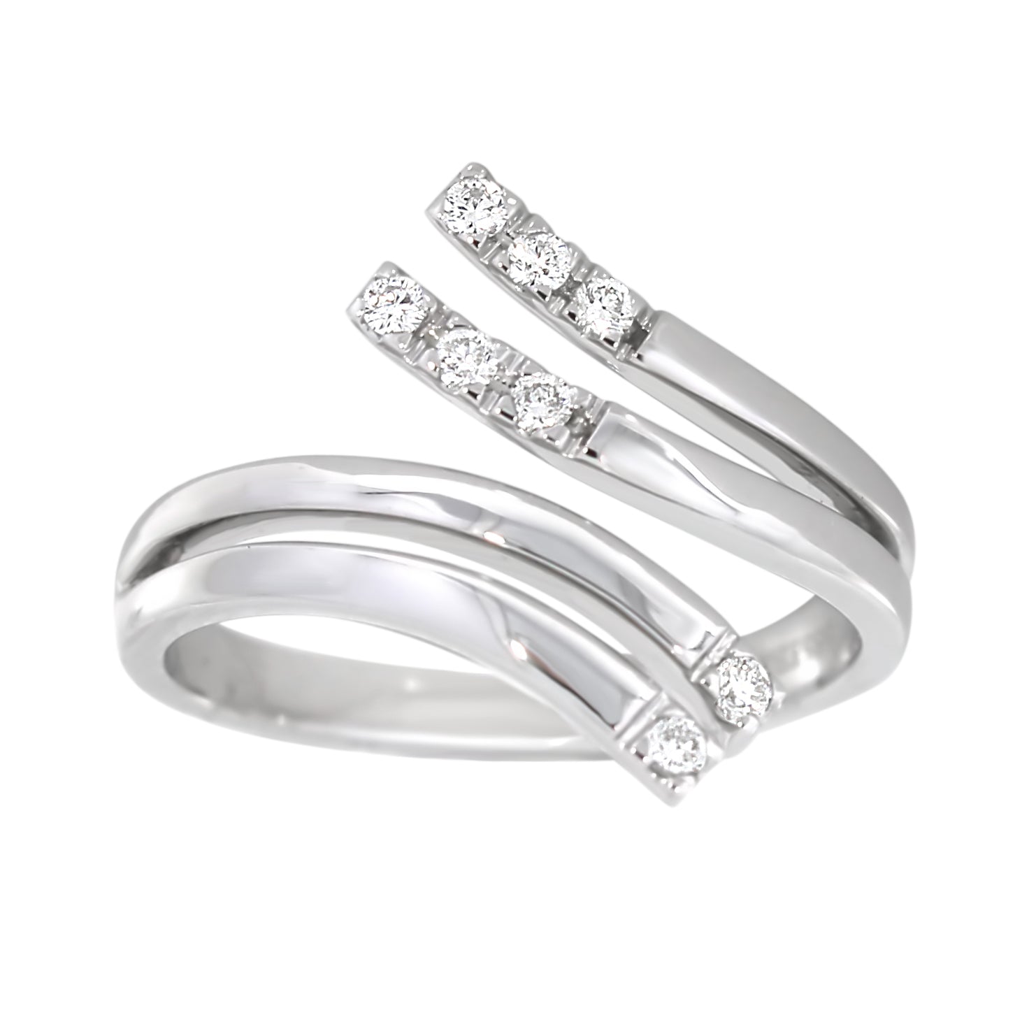 Elegant ring i hvitt gull med et moderne design som leker med form og bevegelse. Seks brillantslipte diamanter på totalt 0.15 ct er diskret fordelt langs de åpne båndene, noe som gir ringen et luftig og raffinert uttrykk. En stilfull kombinasjon av glans og geometri.