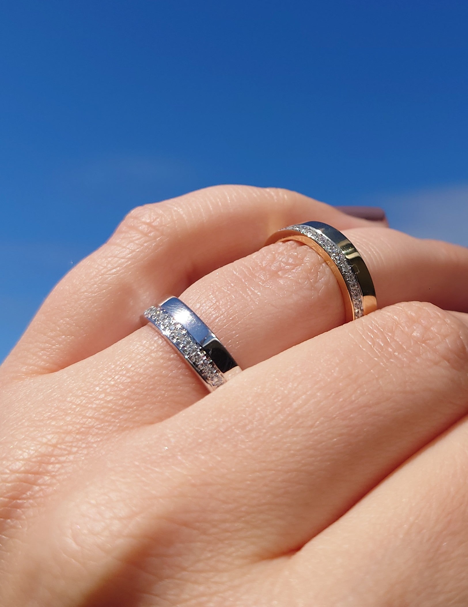 Denne moderne ringen i hvitt gull kombinerer en bred og glatt overflate med en innfelt rekke av briljantslipte diamanter på til sammen 0.20ct. Designet skaper en tydelig kontrast mellom det blanke metallet og diamantrekken, som tilfører ringen et eksklusivt uttrykk. Et godt valg for den som ønsker et tidløst og stilsikkert design med noe ekstra.