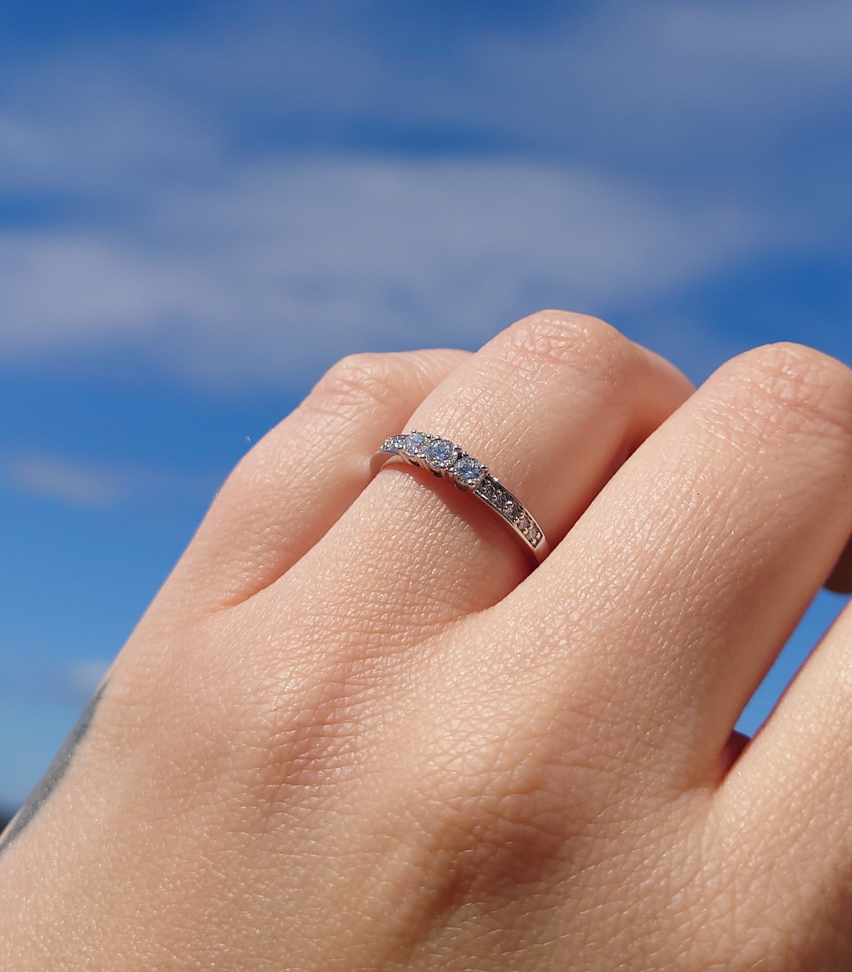 Forlovelsesring i 14 karat hvitt gull med tre diamanter i senter og en rad mindre stener langs hver side av skinnen. Den klassiske trestensdesignen symboliserer fortid, nåtid og fremtid, og gir ringen et gjennomtenkt og varig uttrykk. Totalt 0.45 ct TW/SI-diamanter gir god glans og en følelse av kvalitet. En solid og elegant modell som kombinerer tradisjon og detaljer i en tidløs helhet.