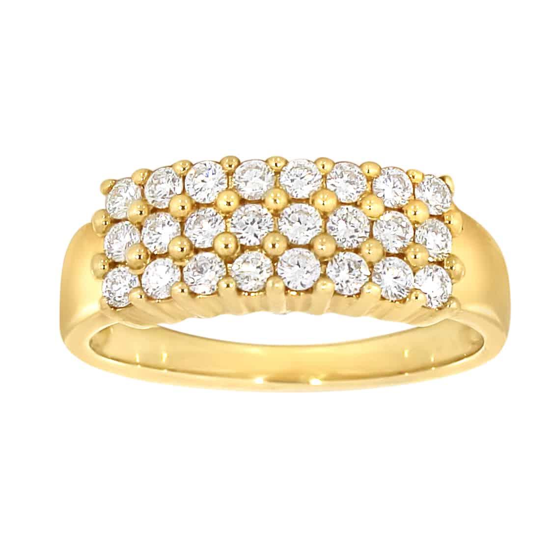 Elegant ring i 14 karat hvitt gull med tre rader av glitrende brillantslipte diamanter. Den brede utformingen gir et eksklusivt og kraftfullt uttrykk, samtidig som de delikate diamantene tilfører ringen et sofistikert og tidløst preg. Perfekt for deg som ønsker et blikkfang med stil og eleganse.
