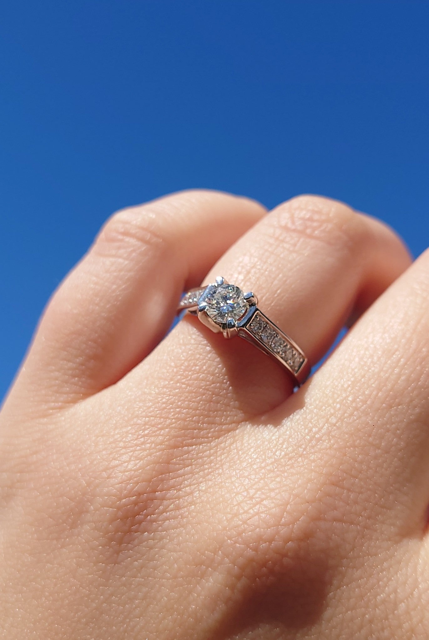 Denne ringen i hvitt gull kombinerer en imponerende midtdiamant på 0,50ct med en solid fireklørsinnfatning og en skinne dekorert med briljantslipte diamanter. Designet gir en kraftfull og elegant helhet, perfekt for deg som ønsker noe iøynefallende med klassisk utforming. En favoritt til både forlovelser og markering av spesielle anledninger.