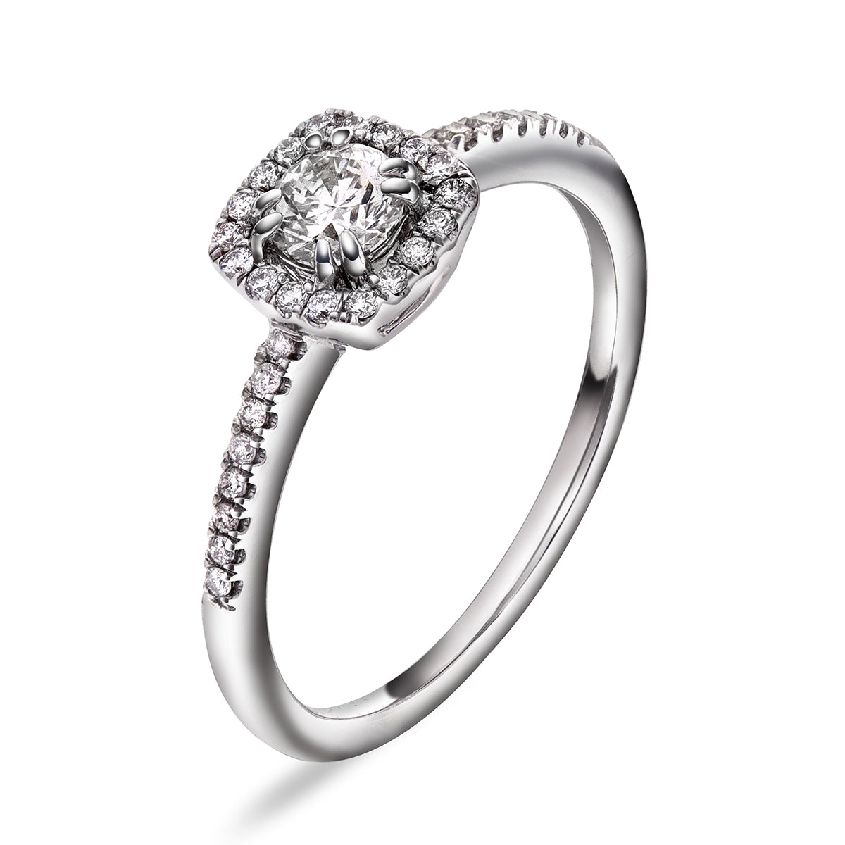 Luksuriøs og gripende – denne diamantringen i hvitt gull er et storslått symbol på kjærlighet. Med hele 0.50 ct briljantslipte diamanter, innfattet i en glitrende halo og skinne, stråler ringen med tidløs eleganse og dyp mening. Den sentrale diamanten fanger lyset som selve hjertet i et livslangt løfte. Et uforglemmelig valg til den viktigste anledningen i livet.