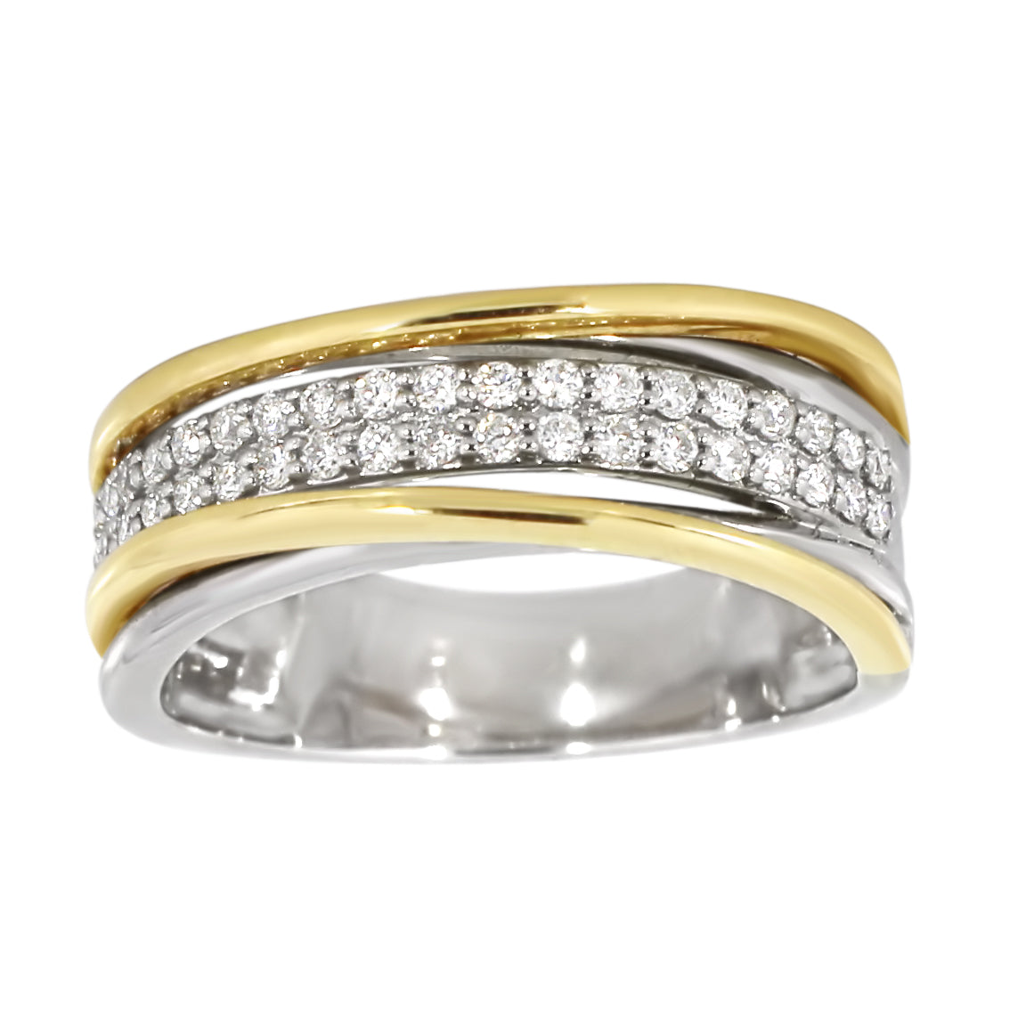 Eksklusiv ring i 14 karat gull med et elegant bølgende design som kombinerer hvitt og gult gull i en harmonisk helhet. Midtpartiet er dekorert med to rekker brillantslipte diamanter på totalt 0.35 ct TW/SI, som fanger lyset og skaper et levende spill mellom glans og struktur. De avrundede linjene gir ringen et mykt og moderne uttrykk med høy komfort.