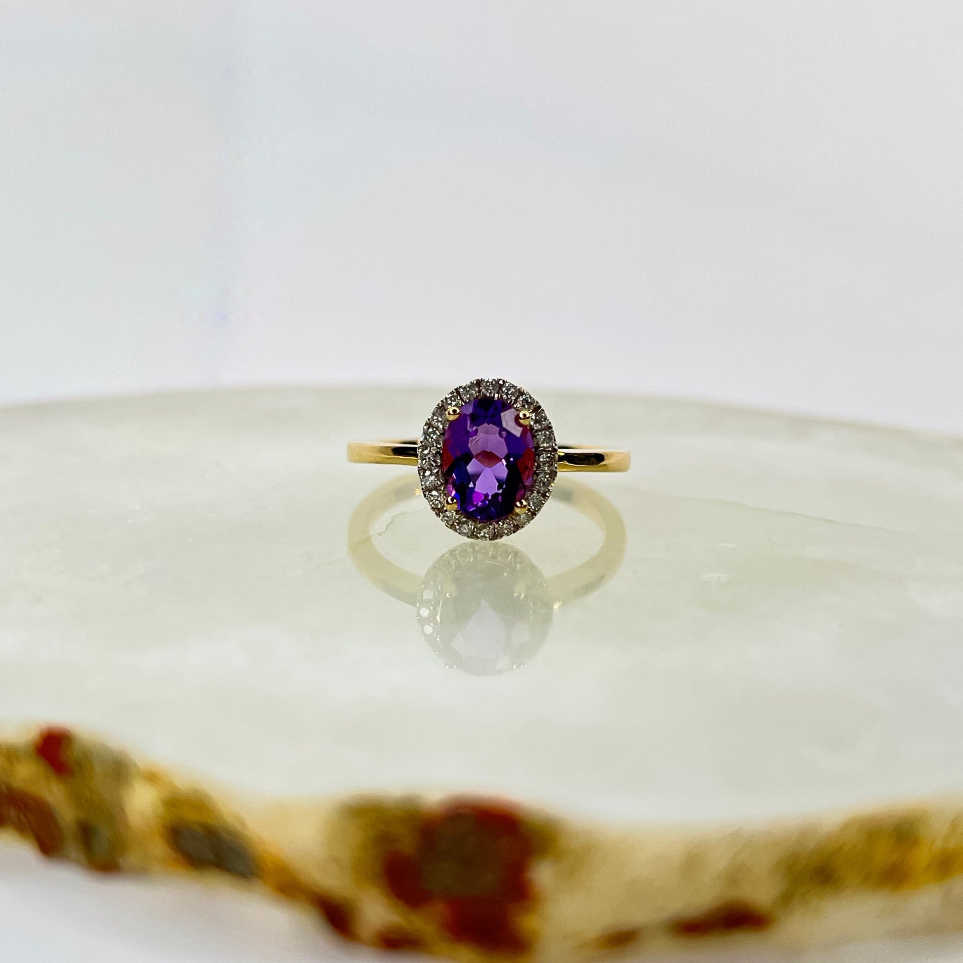 Eksklusiv ring i 14 karat gult gull med en oval ametyst på 1,60 ct, vakkert innrammet av 0,30 ct briljantslipte diamanter. Den dype lilla ametysten gir ringen et livfullt og elegant uttrykk, mens de glitrende diamantene tilfører en strålende og tidløs glans. Et smykke som kombinerer luksuriøs fargeprakt med klassisk design – perfekt for deg som ønsker et iøynefallende og stilfullt uttrykk.
