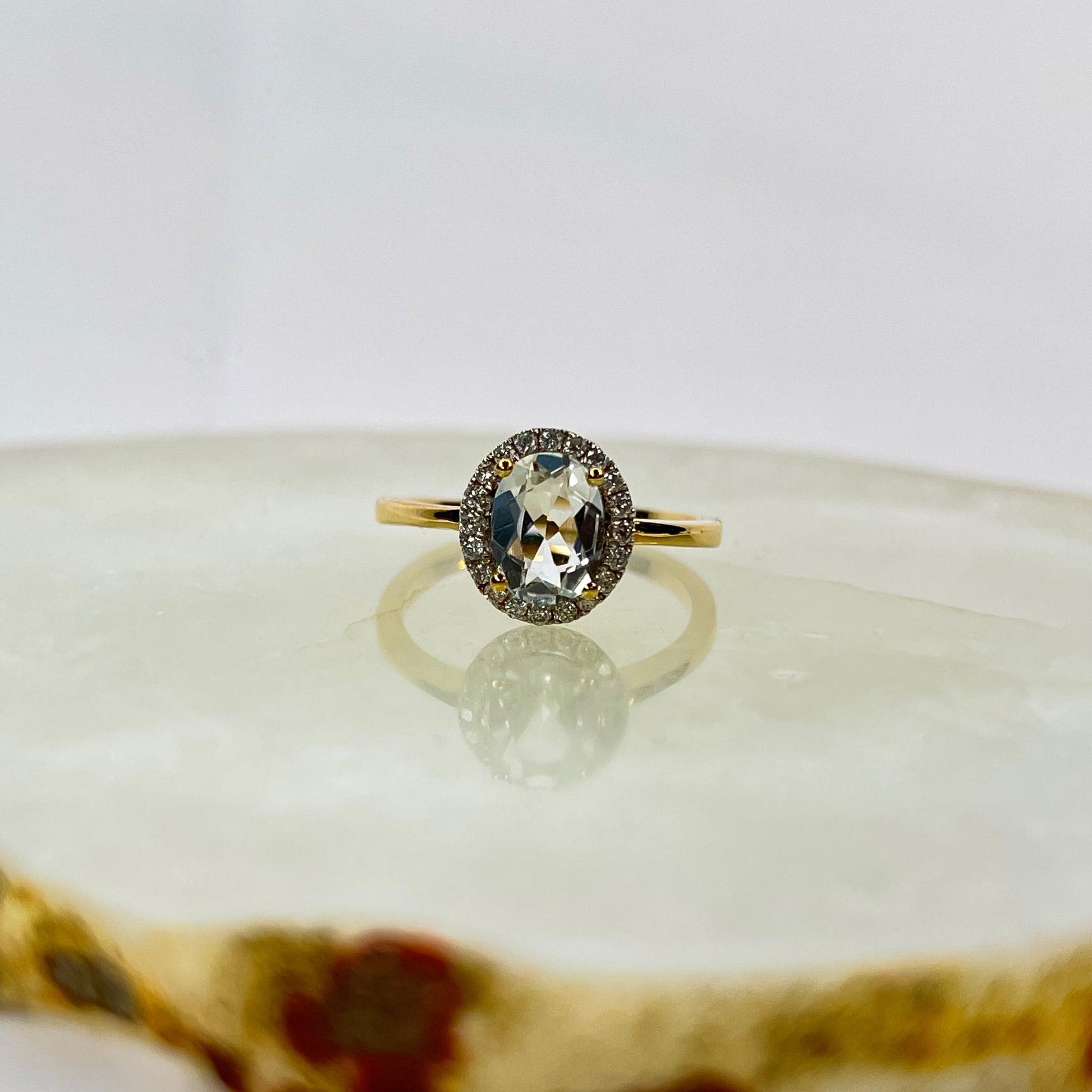 Strålende ring i 14 karat gult gull med en imponerende hvit topas på 1,60 ct, vakkert omkranset av 0,30 ct briljantslipte diamanter. Den klare topasen gir ringen et eksklusivt og luksuriøst uttrykk, mens diamantene tilfører en tidløs glans og et blendende lys- og glansspill. Et perfekt smykke for deg som ønsker en iøynefallende ring med elegant design og utsøkt håndverk.