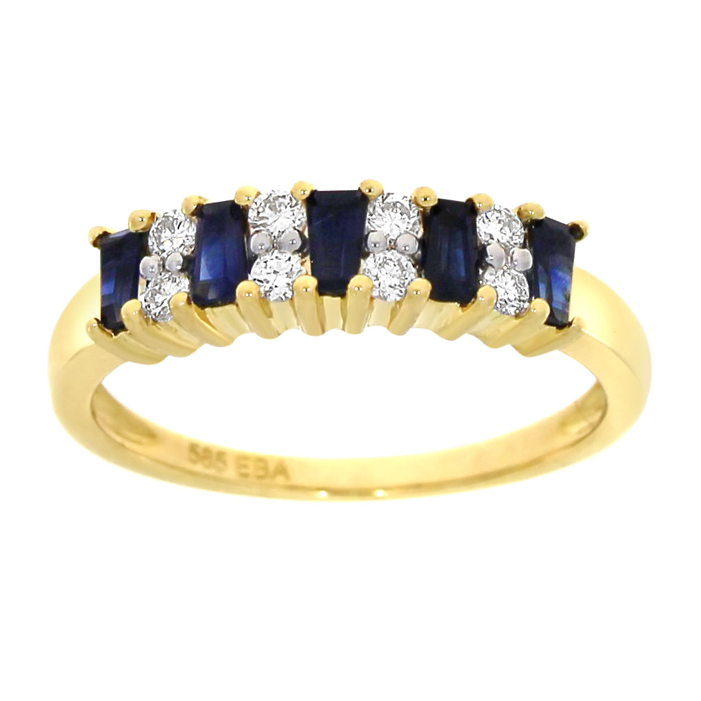 Elegant ring i 14 karat hvitt gull med en elegant kombinasjon av dype blå safirer og 0,21 ct briljantslipte diamanter. De rektangulære safirene skaper et klassisk og sofistikert uttrykk, mens de glitrende diamantene mellom hver safir tilfører ringen en eksklusiv og strålende glans. Et smykke som løfter enhver stil med sitt raffinerte design og førsteklasses håndverk.