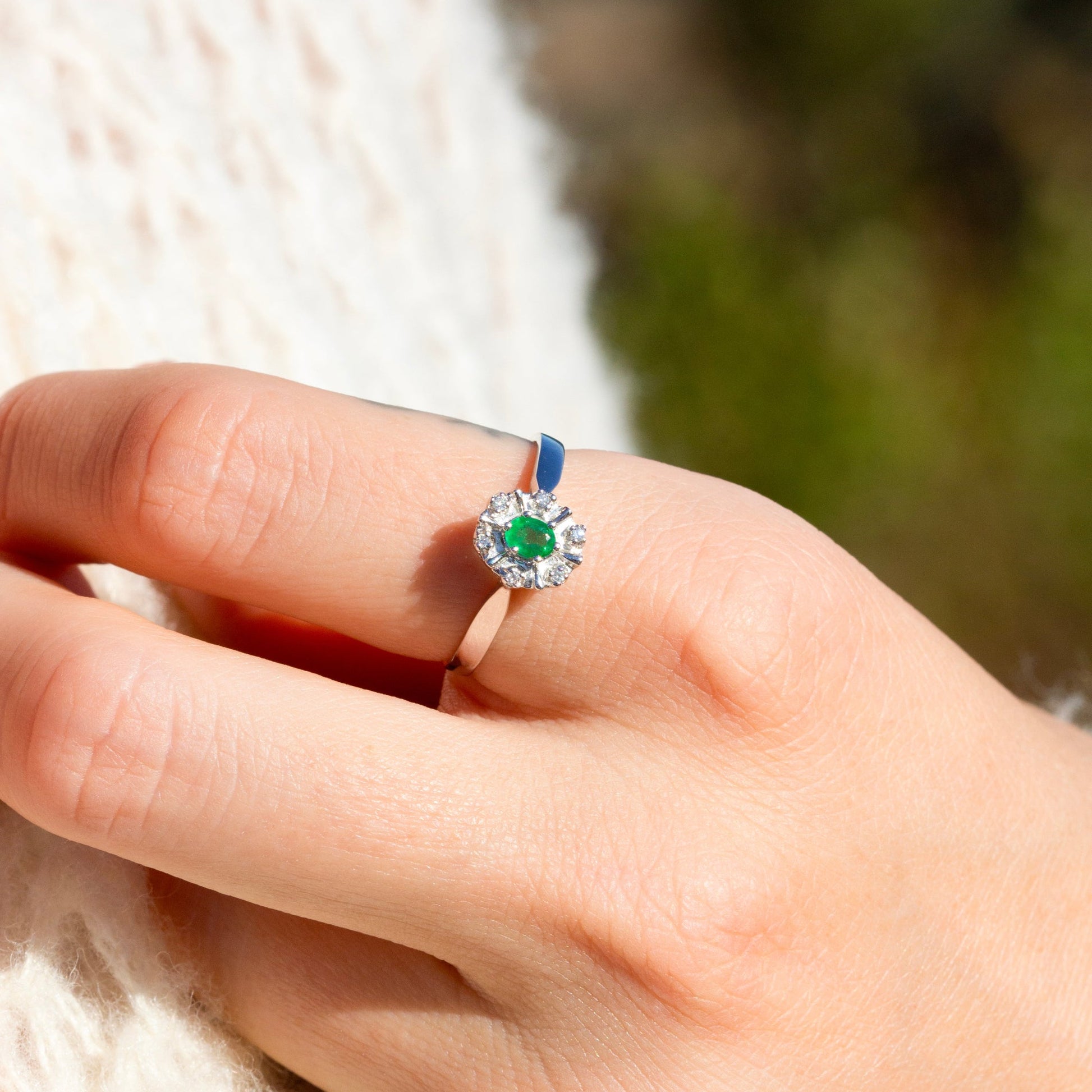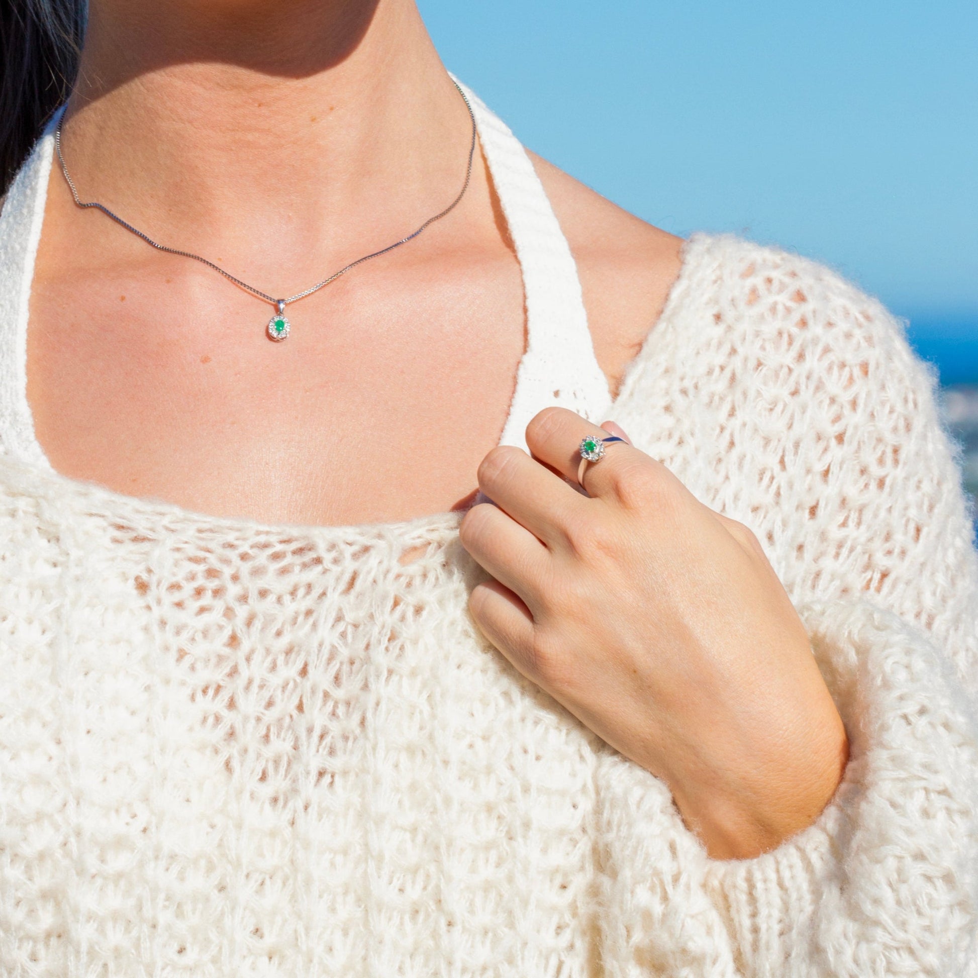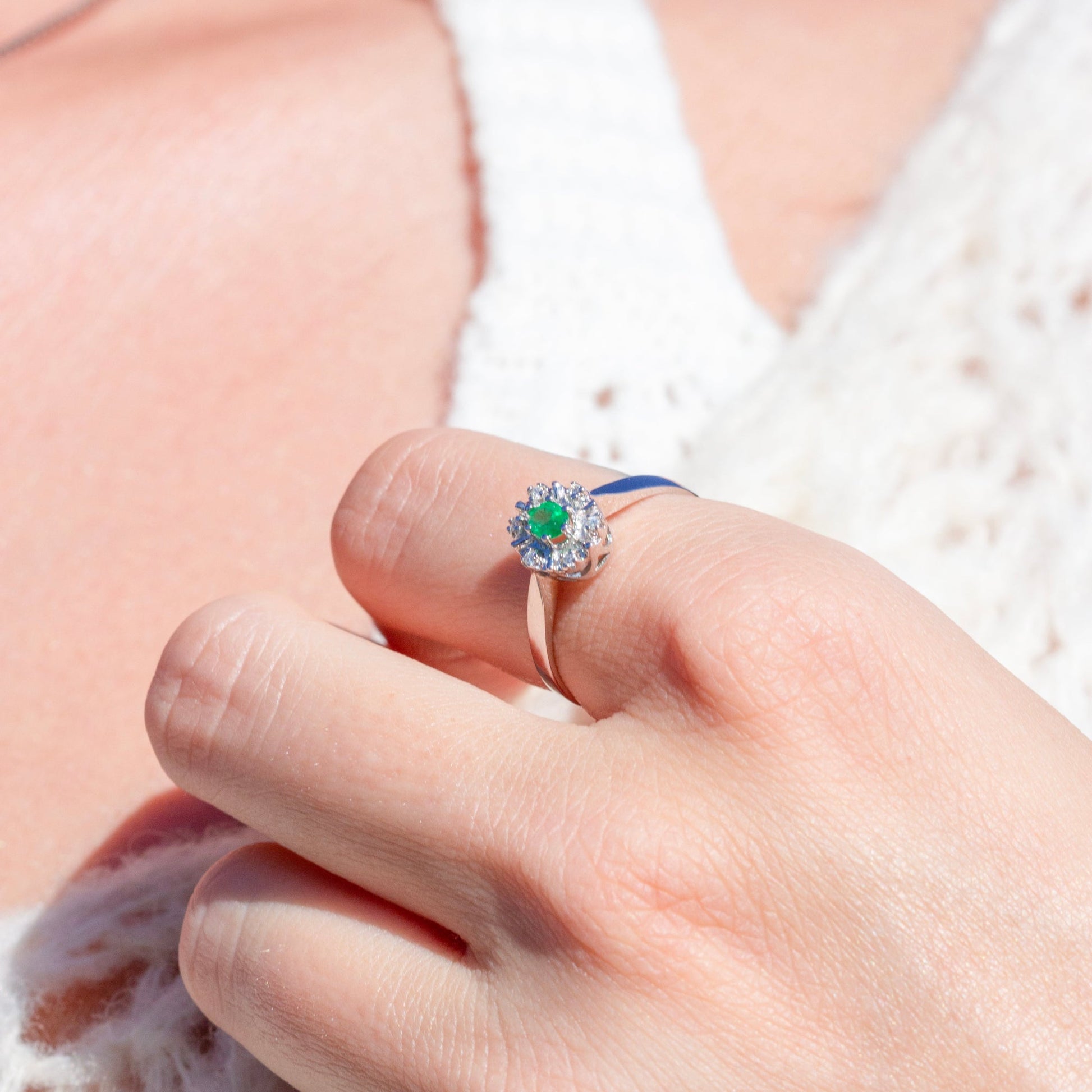 Elegant ring i 14 karat hvitt gull med en dypgrønn smaragd som midtpunkt, vakkert omkranset av 0,03 ct briljantslipte diamanter. Den klassiske kombinasjonen av smaragd og diamanter gir ringen et tidløst og sofistikert uttrykk, mens den delikate utformingen tilfører en lett og raffinert eleganse. Et smykke som tilfører et eksklusivt preg til både hverdagsbruk og spesielle anledninger.