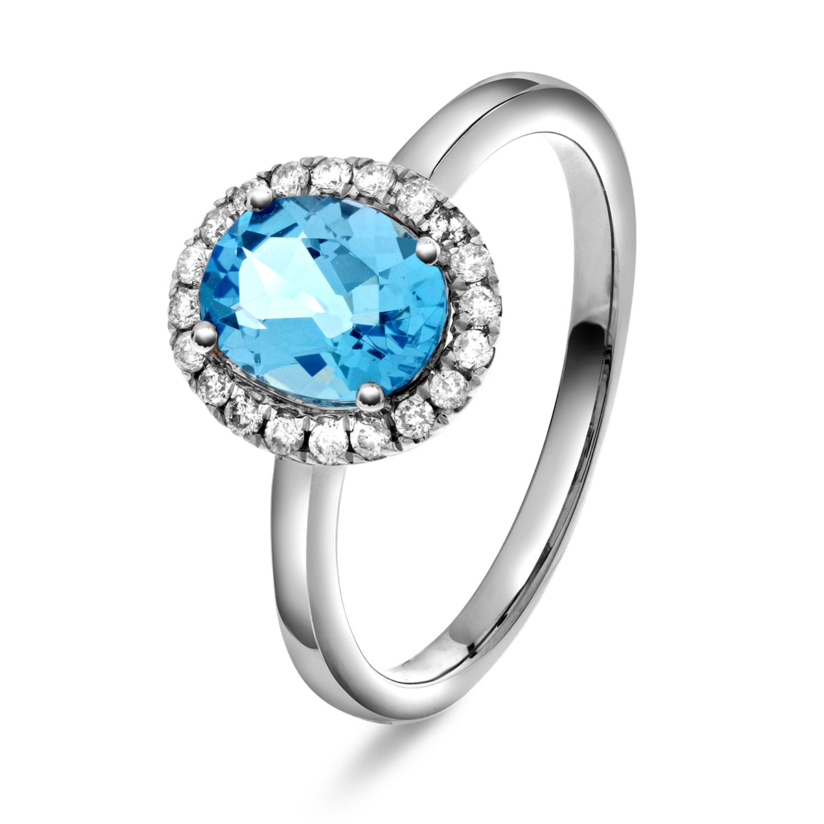 Strålende ring i 14 karat hvitt gull med en oval topas på 1,60 ct, vakkert omkranset av 0,30 ct briljantslipte diamanter. Den klare blå topasen gir ringen et friskt og sofistikert uttrykk, mens de glitrende diamantene skaper en tidløs og elegant ramme. Et perfekt smykke for deg som ønsker en iøynefallende ring med luksuriøst design og førsteklasses håndverk.