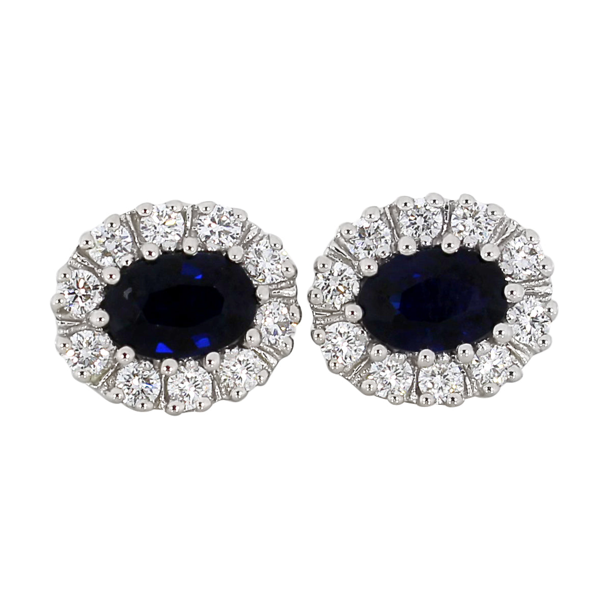 Tidløs diamantørepynt i 14 karat hvitt gull med safirer på 1.30 ct og 0.50 ct TW/SI diamanter. Den dype blå edelstenen står i nydelig kontrast til diamantene og gir et raffinert og kongelig uttrykk. Den ovale fasongen gir smykket balanse, mens hvitt gull sikrer et moderne preg.