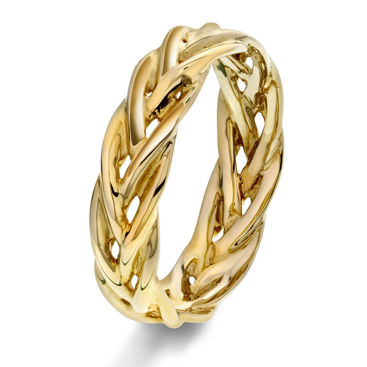 Kraftig ring i gult gull med et gjennomført flettemønster som gir et eksklusivt og skulpturelt uttrykk. Den åpne strukturen tilfører ringen en luftig letthet, samtidig som den brede utformingen gir et solid preg. Et iøynefallende smykke som kombinerer håndverksdetaljer med tidløs eleganse.