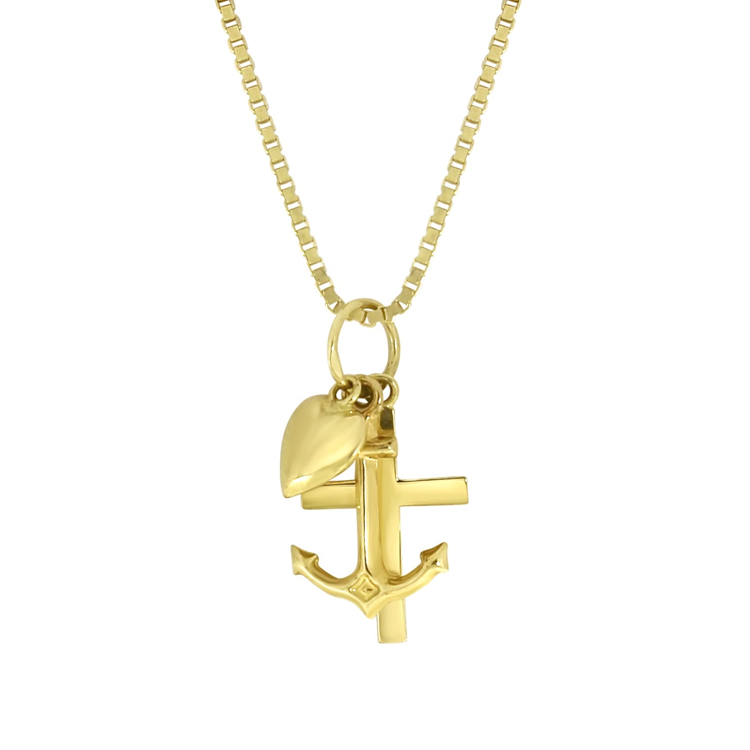 Tidløst smykke i 14 karat gult gull med tre symboler: et kors, et hjerte og et anker – klassiske tegn på tro, håp og kjærlighet. Det glansfulle gullet gir et varmt uttrykk og en sterk visuell tilstedeværelse.