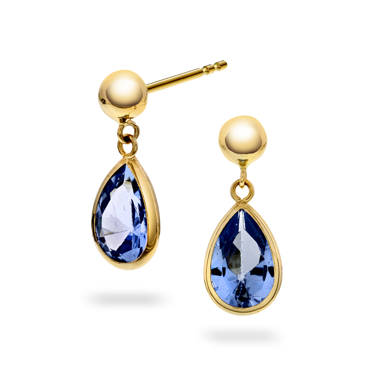 Gullørepynt i 14kt Gult Gull (585) - Dråper med Farget Zirkonia - Blå