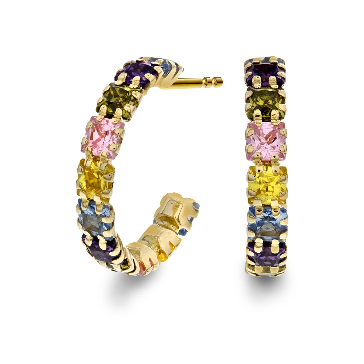 Fargerike øredobber, utsmykket med zirkoniastener i flere nyanser satt i gullfarget metall. De fasetterte stenene kombinerer varme og kalde toner for et levende og lekent uttrykk. Klørne gir struktur og fremhever hver steins individuelle glans.