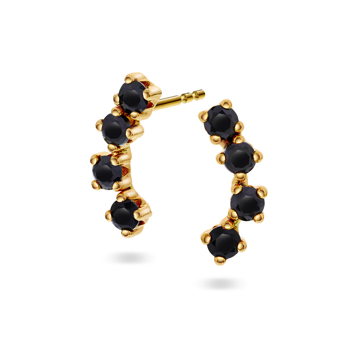 Moderne ørepynt i halvsirkel med dypsorte zirkoniastener innfattet i gullfarget metall for et elegant og kraftfullt uttrykk. Hver sten er festet med klør som gir struktur og glans, mens den buede formen omslutter øreflippen med presisjon og stil. Designet skaper en iøynefallende silhuett med tydelig kontrast.