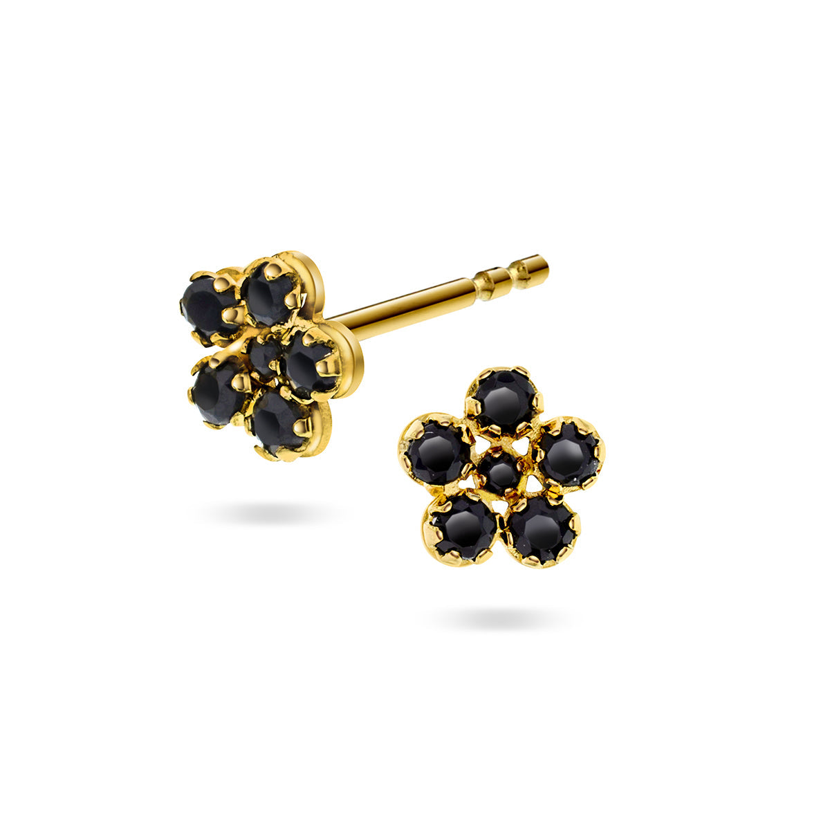 Iøynefallende øredobber i gullfarget metall med blomsterformet design og dyp sorte zirkoniastener. De fasetterte stenene er satt i elegante klør som danner små blomster langs en svakt buet linje, og gir smykket et kraftfullt og sofistikert uttrykk. Kontrasten mellom det mørke og det varme metallet skaper visuell dybde og karakter.
