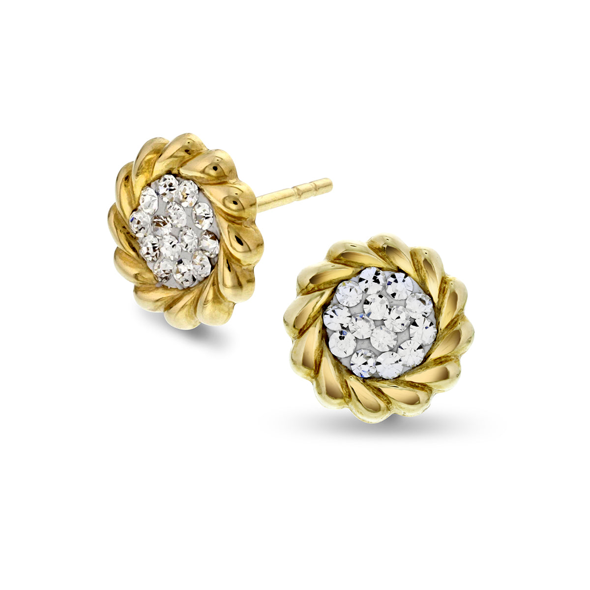 Vintage-inspirert ørepynt i gult gull med en tvunnet ramme som omfavner en sirkel av glitrende zirkoner. Detaljrik utførelse gir øredobbene dybde og karakter, samtidig som det blanke midtpartiet fanger lyset elegant. Designet kombinerer klassisk ornamentikk med en sofistikert glans.
