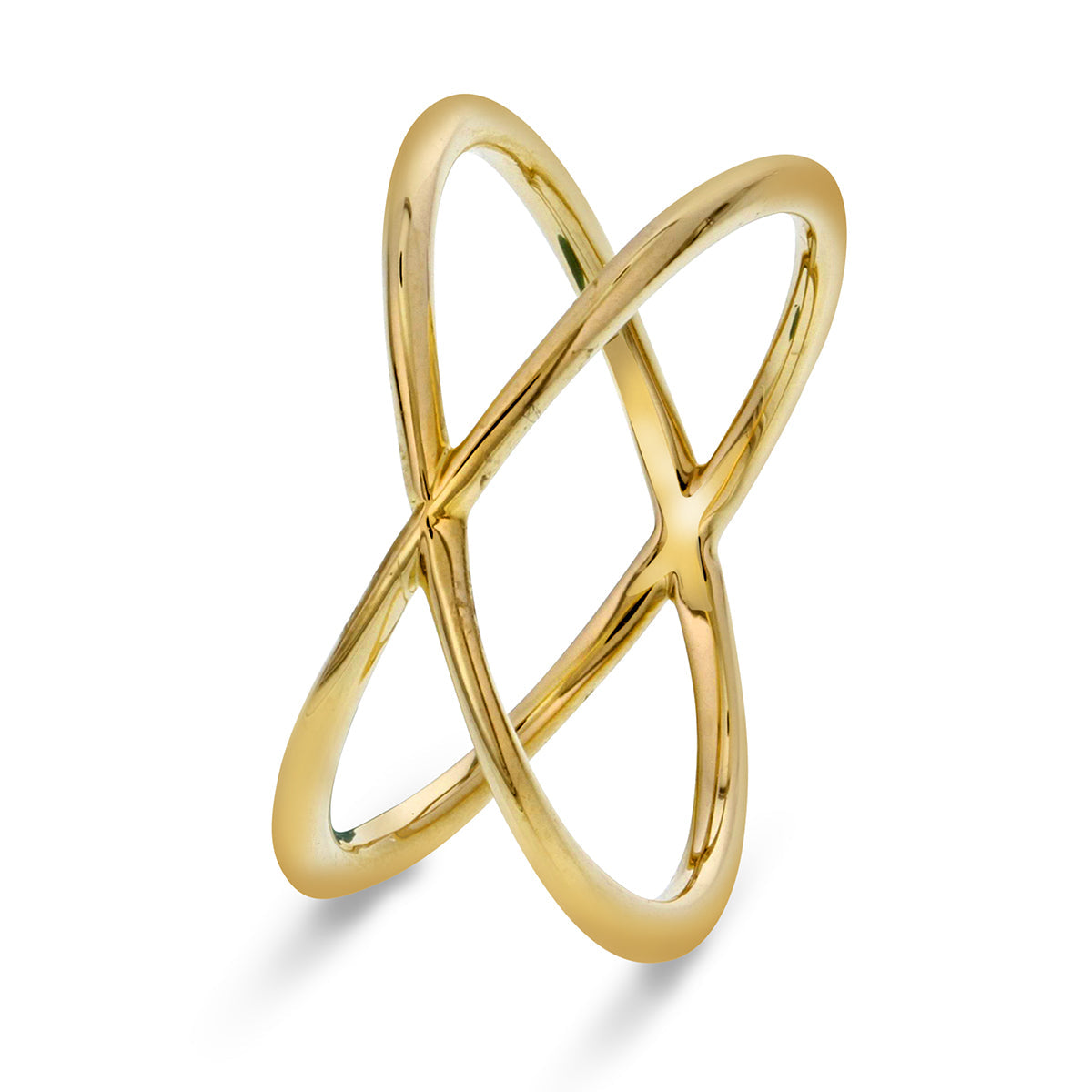 Stilren ring i gult gull med et dristig kryssdesign som omslutter fingeren i elegante linjer. Den åpne formen skaper et moderne uttrykk med visuell letthet, samtidig som den gir ringen en iøynefallende karakter. Et uttrykksfullt smykke som passer like godt alene som sammen med andre ringer.
