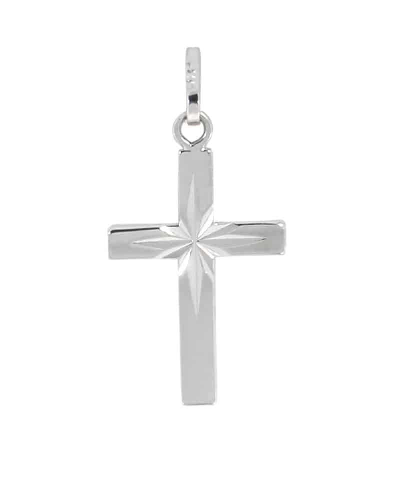 Tidløst kors hals smykke i 14KT (585) hvitt gull. Korset har et vakkert gravert mønster.