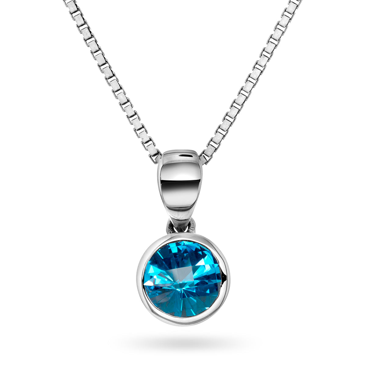 Den klare blå topasen er bezel-innfattet i glatt hvitt gull som gir smykket et friskt og raffinert uttrykk. Edelstenens lyse fargetone får fullt fokus gjennom det rene designet, mens det polerte metallet tilfører en kjølig og luksuriøs ramme.